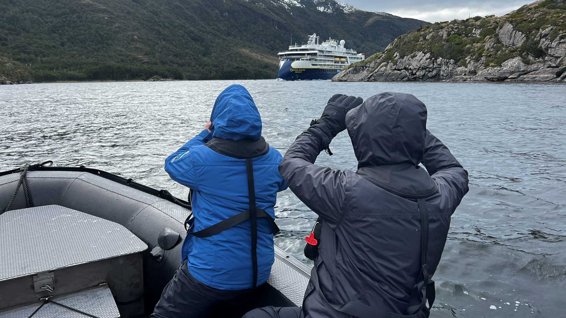 One Zodiac hovered in the narrows, observing the changing current and reporting back to the ship. The rest of us spread out and explored the labyrinthine channel, poking around and behind the islands. Andean condors soared very low overhead, while curious sea lions showed off for the photographers.