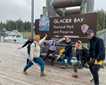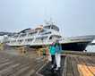 Our first off-ship activity began at 9:00 a.m. with Zodiac tours of the water directly below the ice-cliff terminus of South Sawyer Glacier. Using the nimble rubber boats we motored close (but not too close) to icebergs and bergy-bits, and we watched as harbor seals swam nearby or rested on the ice. Gulls, Arctic terns, and a few eagles flew near the ice cliff, occasionally diving to snatch a fish from the icy water. We spotted several mountain goats grazing on the steep slopes of the fjord.