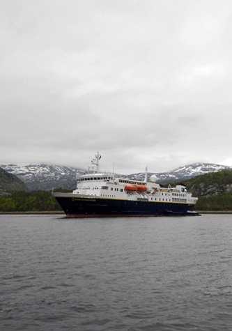 Today we sailed up another of Norway’s spectacular fjords, Tysfjorden. We anchored at the end of the fjord and made a landing along the river which flows from the mountains on the Swedish-Norwegian border and which creates several very large waterfalls before ending in the fjord. On the beach at the end of the fjord is a Saami summer hunting and fishing camp. The site is called Hellemoboten which probably refers to the meadow near the water of the fjord. Only a few of the residents were on the site, as it is early in the year, but those who were there were working on bringing the several buildings into shape for the summer. We had some very friendly interactions with these Saami, one of whom was born there when the site was occupied year round.