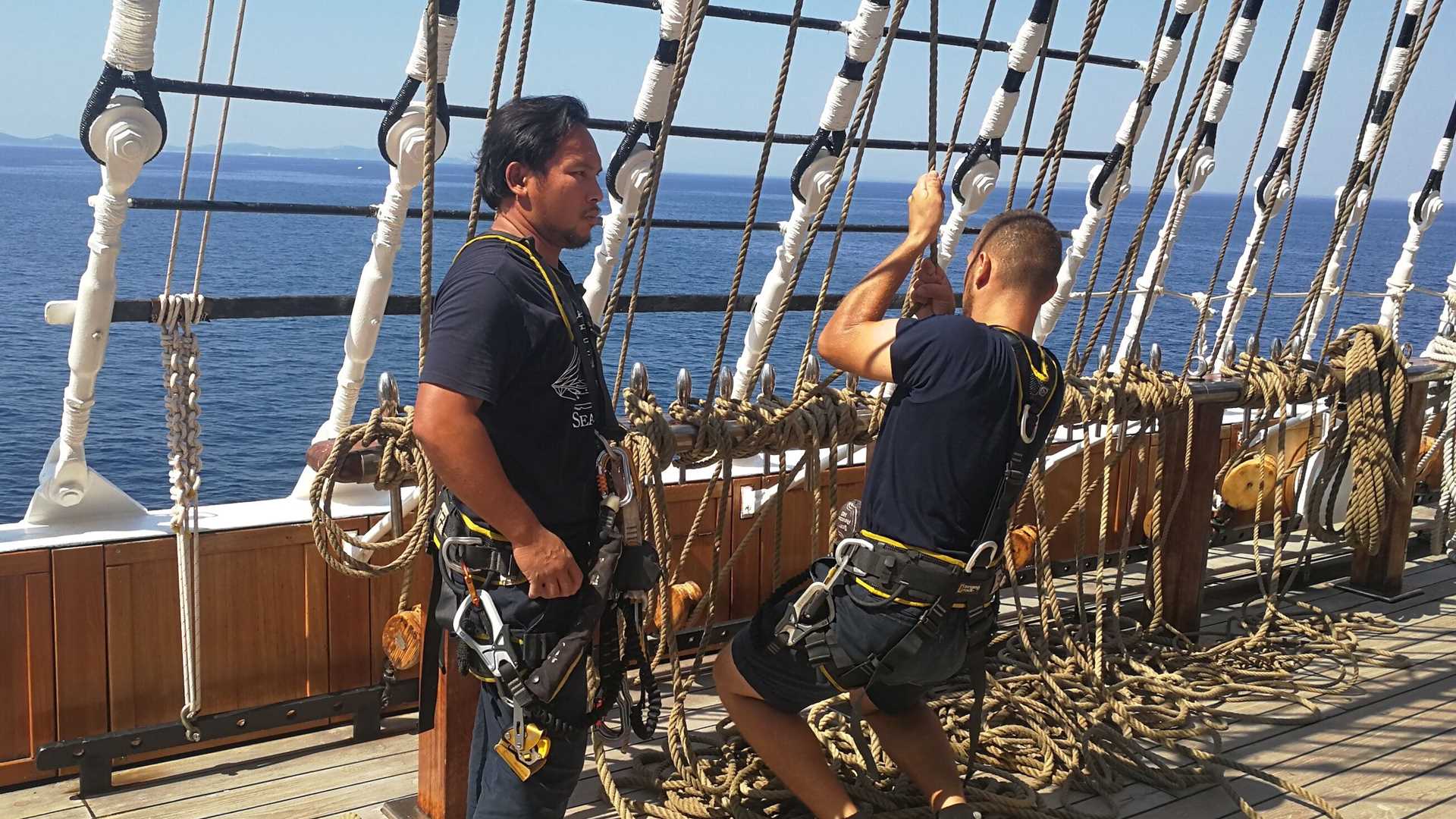 This morning, we sailed over the deep blue waters of the Adriatic Sea. As soon as the weather allowed it, the daring ones amongst us had the unique chance to climb the riggings of a tall ship! Under the supervision of the captain and with the help of Sea Cloud II sailors, we braved the heights, reaching the first platform of the main mast. Many guests watched from the deck in awe of the bravery of their fellow travel companions.