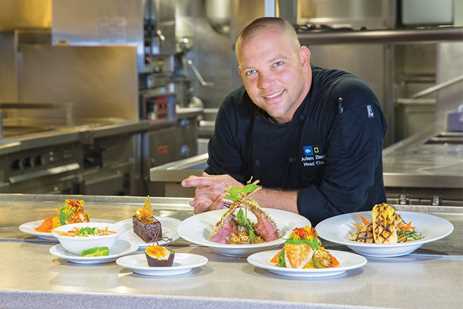 Meals are served in the dining room at a single seating with unassigned tables for an informal atmosphere and easy mingling. Menus feature sustainable choices, local where possible.