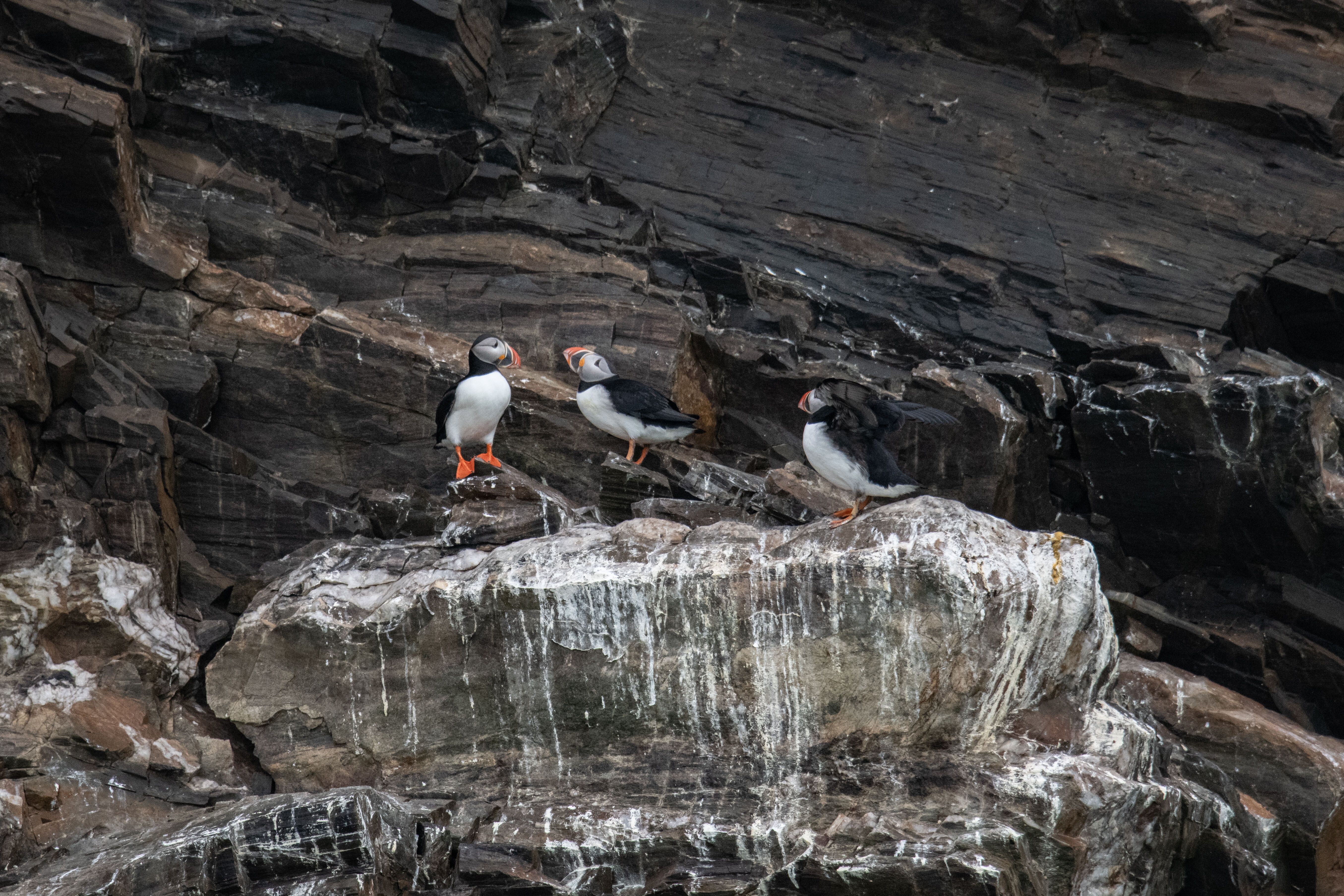 In the afternoon, we went Zodiac cruising in the famous 14th of July Bay. We explored under the bird cliffs and observed guillemots, eider ducks, gulls, and, of course, the beloved puffins. We spotted a dozen reindeer on the tundra while we viewed the glacier. We spent some time near the glacier and were lucky to spot calving (ice breaking off and falling into the sea) as we navigated around the brash ice.