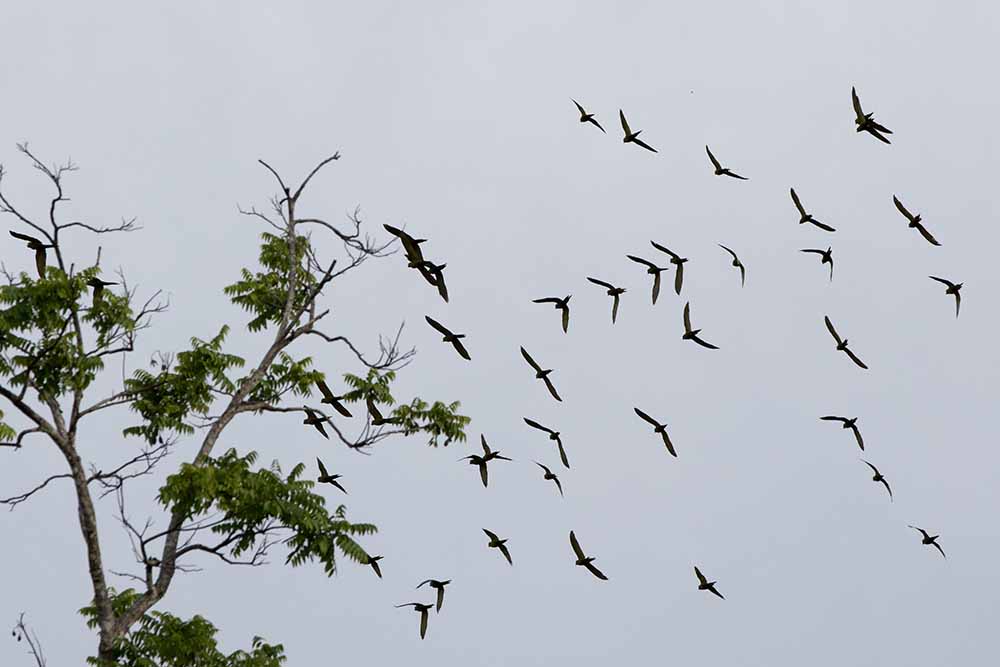 In the afternoon we disembarked to visit Yarapa River. Here, we went for a walk in the forest among large fig trees and palms. The trail took us to a clear spot in the middle of the forest. It was a swamp full of giant lily pads and wading birds! It was surprising to see lily pads in the middle of a forest ruled by giant trees and vines and epiphytes. Most trees are fruiting at this time and very often they host large flocks of fruit eaters, some are the amazing and colorful macaws! The rivers are teeming with wading birds, fish and pink dolphins.