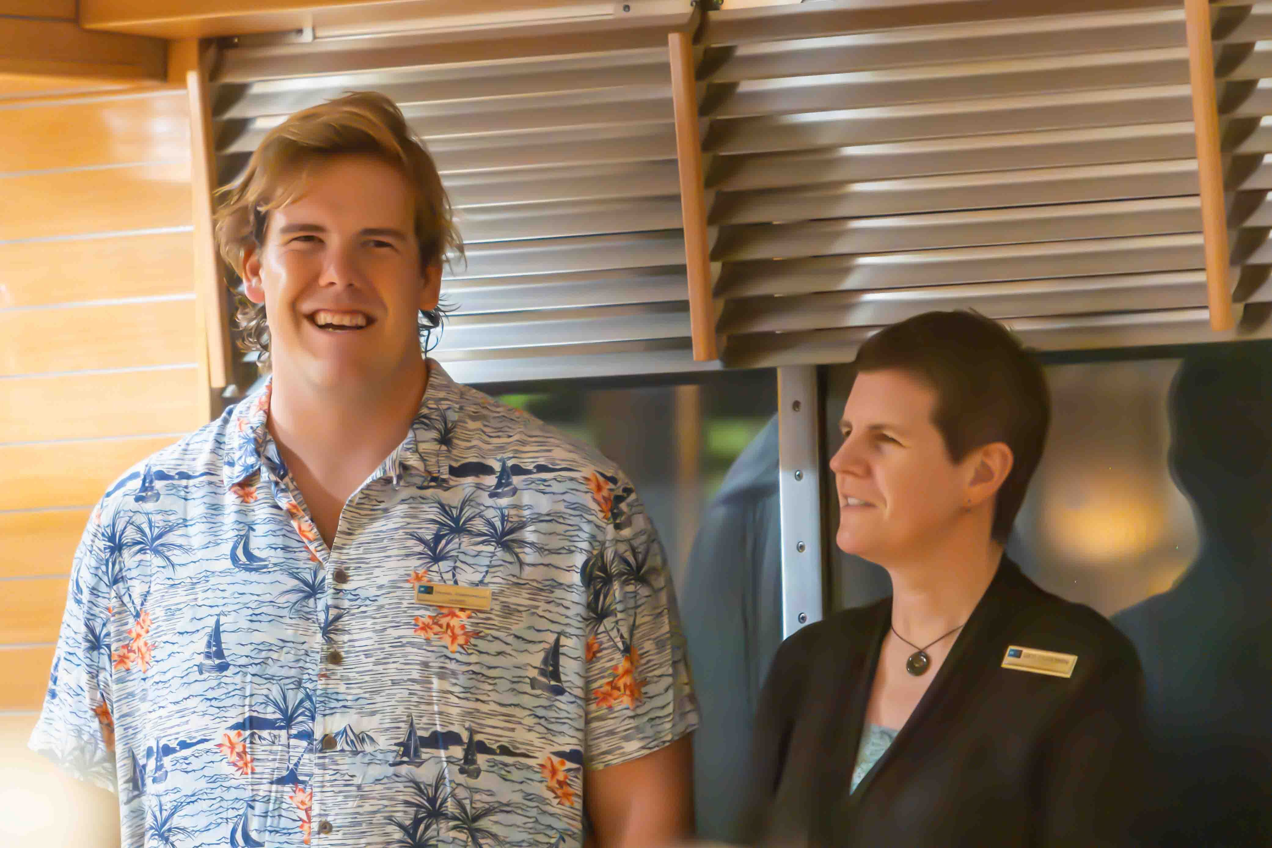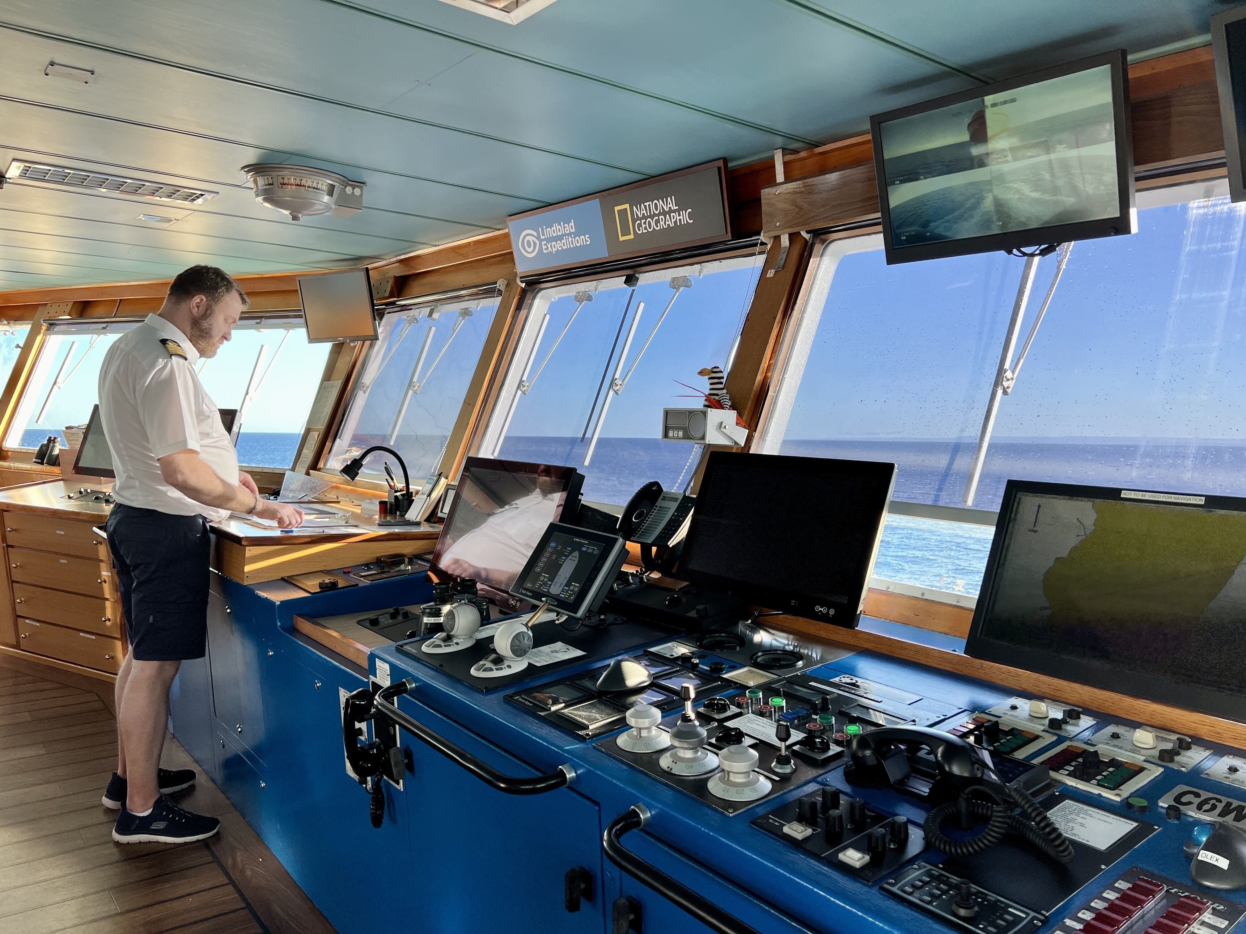 During a day at sea on board National Geographic Explorer, there is never a dull moment. A riveting presentation by Eve, our resident whale expert, was complimented this evening by the sighting of a mass pod of short-finned pilot whales. Expedition Leader Lisle Gwynn, who has managed our expedition with a masterful blend of dynamic planning, cool demeanor, and quiet British humor, gave us a run down on what to expect on shore tomorrow. Down below, Ross and Eva sorted through and catalogued some of the on board displays, while up on the top deck, Ming and JR from the mechanical team carried out the endless routine maintenance that keeps our ship safe and sound. An impromptu midafternoon “beer and barbeque” on the aft deck was enjoyed by staff and guests alike, while guests on the bridge kept watch for any further pilot whales as the sun set over the ever-changing seas.