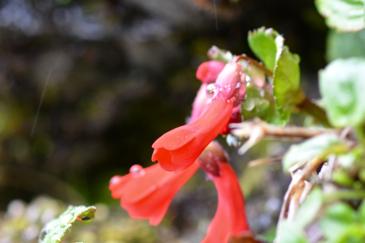 But, it is not all doom and gloom; there is plenty of native life here, much of it unique and beautiful. Where the trees are dead, lichens have taken over, swarming over the tree skeletons and across the bare-ground basking in their many species, shapes and colors. Above the ravaged trees the waterfall provides a particular delight, next to, but not in the torrent lives the ever-elusive ‘waterfall plant’ with a few delicate red flowers, forever moist, thriving in the only place they ever occur!