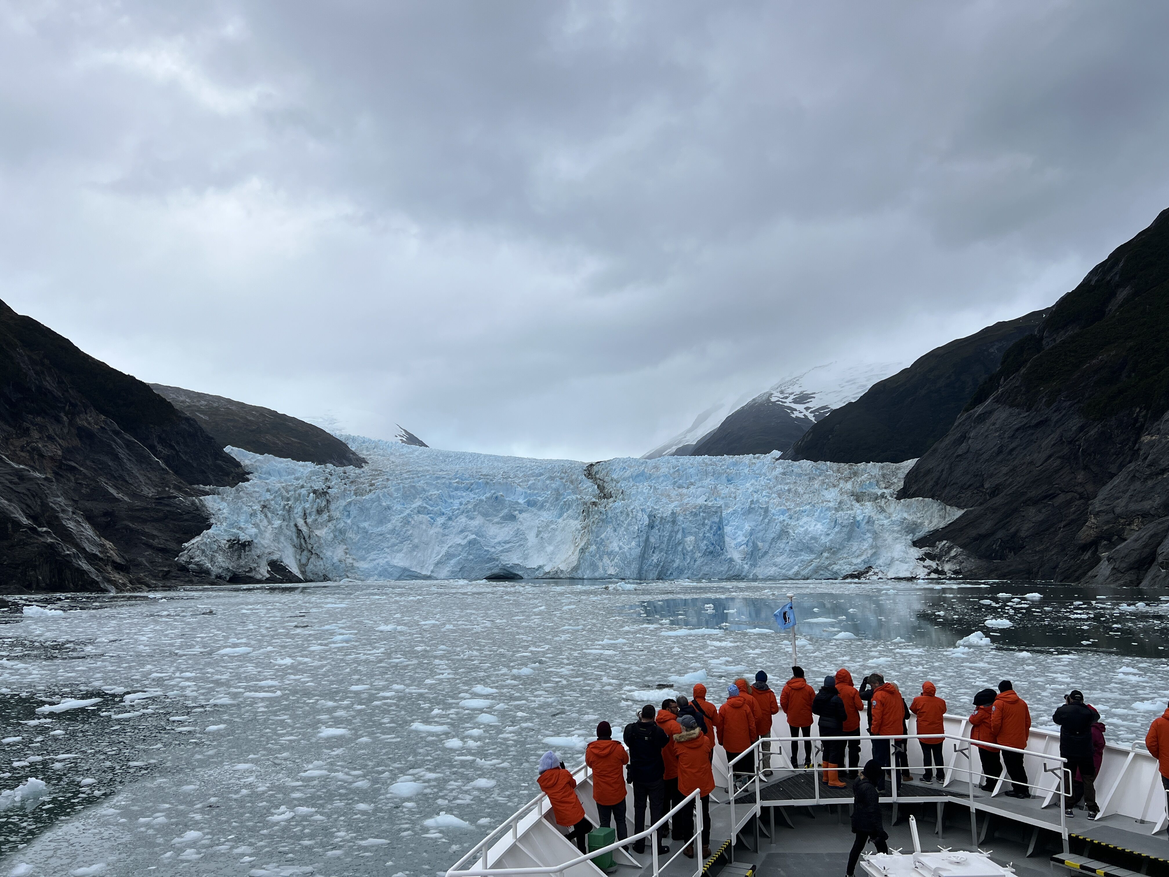 Our morning began with walks to the Aguila Glacier, one of many coming off the Darwin Ice Field here in Tierra del Fuego. Yet again, we were delighted to have sun and warmth, especially after our week in the cold Antarctic weather. There were many details to admire along the way to the glacier, starting with the swirly and striated metamorphic rocks at the shoreline. This was our first landing to observe the Patagonia beech forests, providing a green contrast to the icy continent. Yet another fabulous day adventuring aboard National Geographic Explorer!