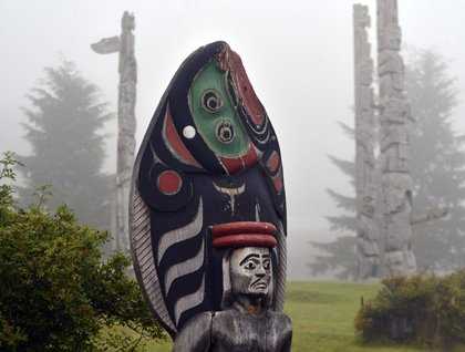 Our wake-up call found the Sea Lion shrouded in a deep marine layer common in the early days of fall. The mists only added mystique to a unique community of people, following many ancient traditional ways while carrying those into the future. Just after breakfast, many of us walked a short distance into the fog to photograph a set of totem poles that are part of the Namgis Burial Grounds. Repacking our cameras, we then boarded a van or enjoyed a mile walk along the waterfront making our way to the U’mista Cultural Center located at the north end of town. The U’mista Cultural Center suffered fire damage recently. Fortunately the bulk of the damage was due to smoke and water from a sprinkler system. The staff had rearranged several of the galleries and created an education space for our group to hear and see a small portion of a very important potlatch collection.