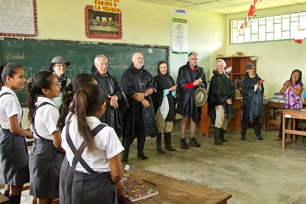 Once on the trail we hiked a couple of miles through the rainforest and learned from our naturalists about many of the notorious plants that people have been using in one way or another over centuries. We met such important species like the rubber tree, whose sap was once the main product harvested in the Amazon and which brought immense wealth to Iquitos and Manaus during the late 1800s. We saw the endless lines of leaf-cutter ants busily carrying pieces of leaves to their holes and wild bee hives. Many other interesting insects like praying mantis, moths and grasshoppers were frequently discovered. Some of us also had the chance to watch a few monkey species, including the saddleback tamarin and the squirrel monkey. But one of the highlights of the Amazon Natural Park is a mid-canopy walk through a series of suspended bridges; we all enjoyed the different perspective and a bird's view of the rainforest below!