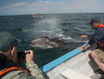 Following lunch we relaxed for a short siesta, and photography enthusiasts attended a photo presentation and hands-on camera session. The afternoon activity featured a wonderful skiff ride to Piraña caño, a narrow waterway surrounded by vegetation and wildlife. We managed to see some terrific birds, including the bizarre-looking hoatzin, as well as a few different groups of squirrel monkeys chattering in the trees. A mother and baby sloth were spotted, and when the skiffs sailed into the floating mats of water lettuce there were many interesting spiders and insects. The skiff ride concluded with a sunset stop to watch (and listen to) thousands of white-winged parakeets flying into their nightly resting place. A storm blew in after we returned to the ship, and after a pisco sour class at the bar, a delicious dinner finished off the day.