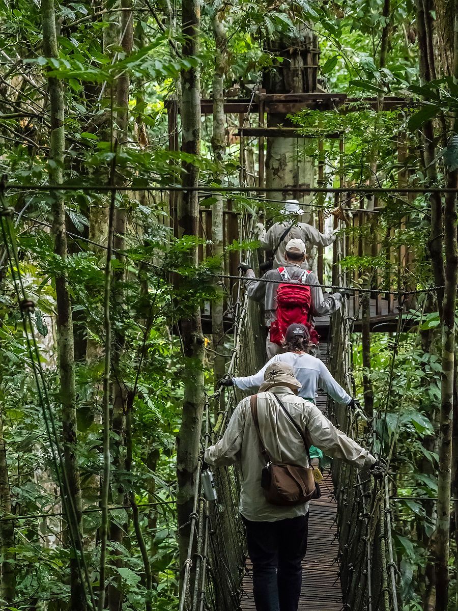 This morning we had the opportunity to stretch our legs in the rainforest on a privately owned and operated 60-acre reserve known as Amazon Nature Park. In addition to the animal life within the reserve, there is the added privilege of crossing an eight-section suspension bridge that affords close-up looks at the mid-level forest canopy. It’s quite a different perspective to be above the vegetation looking down!