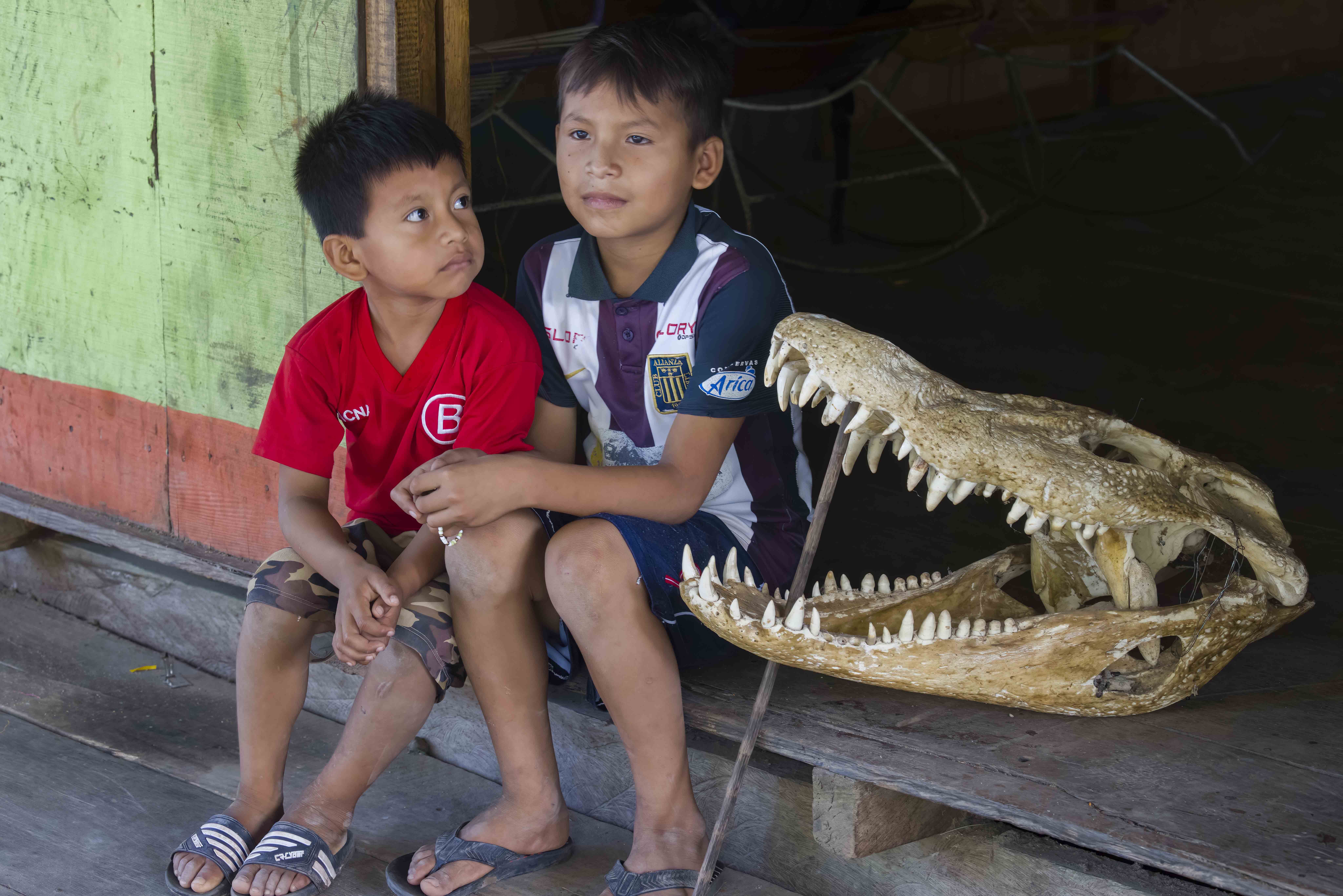 IMAGE: Kukama kids with large black caiman skull at Amazonas village. (Photo by Carlos Navarro)