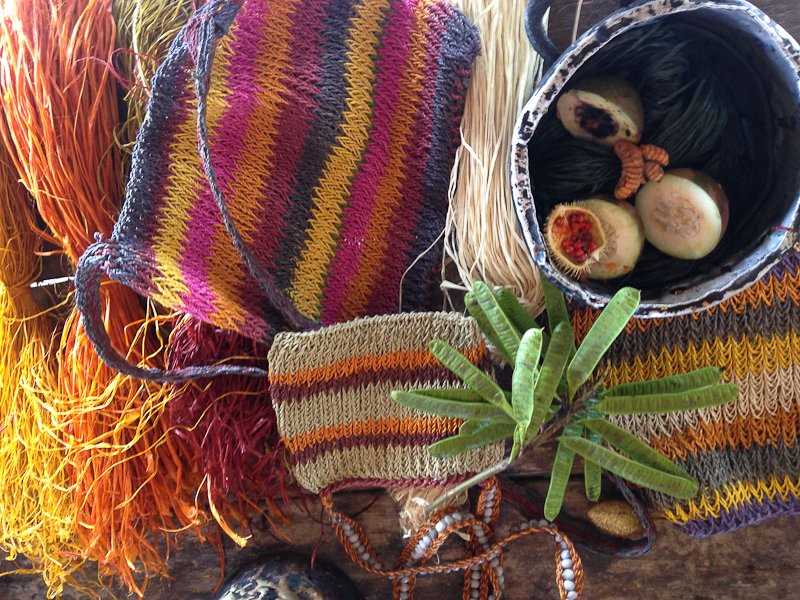 One of the most important materials for making baskets, skirts, handbags, placemats and an infinity of other crafts is a palm called chambira. The fibers are obtained from the new leaves emerging from the top of the spiny palm. With a long stick and a machete on the end, the leaves can be harvested without doing much damage to the palm. After harvesting them, they are boiled and dried under the shade, mixed with different plants and mordents to give them bright natural colors.