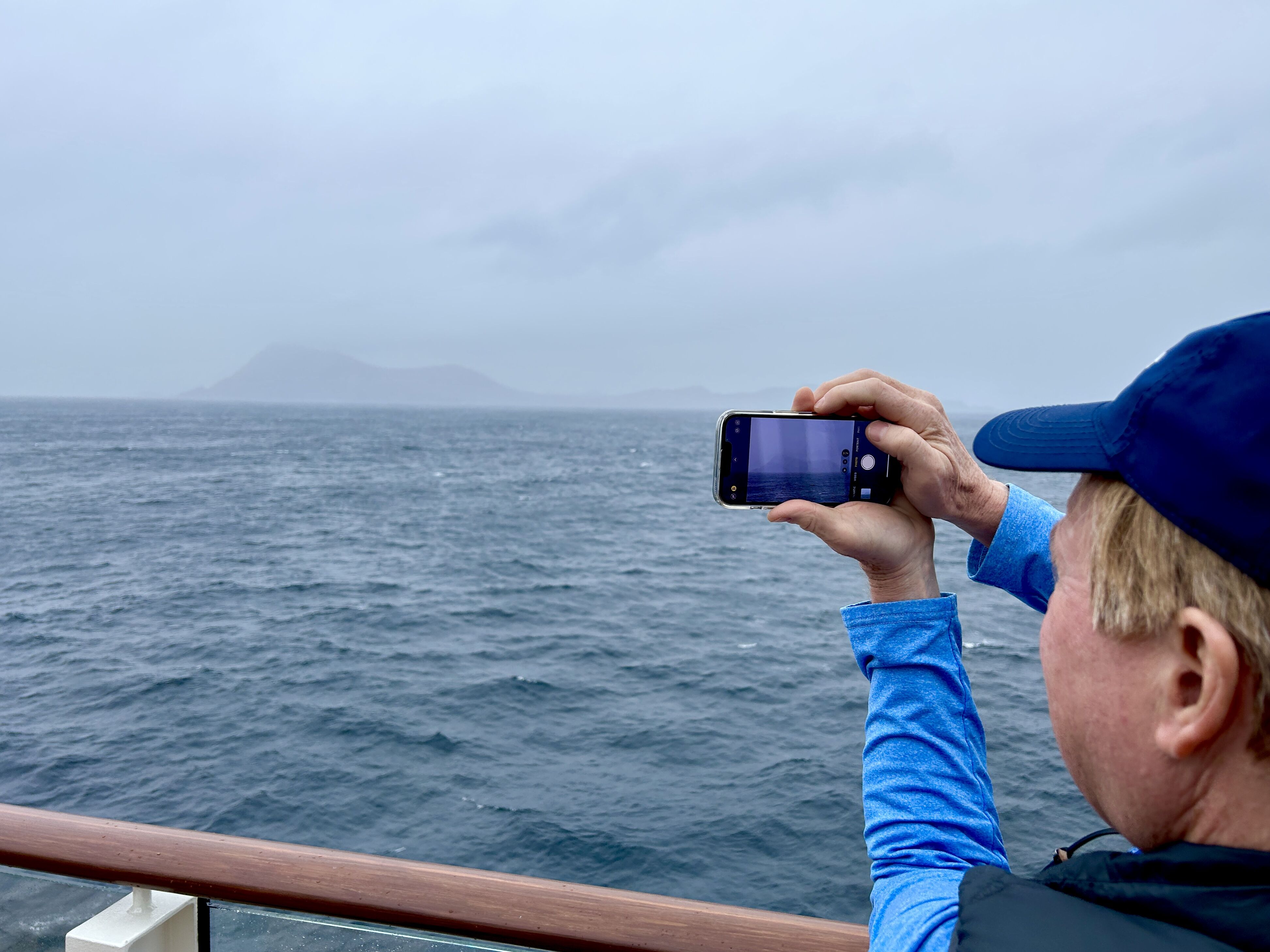 As we left Antarctica, the day was kind to us. The waters of the Drake Passage were as calm as I have seen them. We sailed in calm seas with fog in the distance. We had a later morning and a brunch filled with every possible delicious delight awaited us sleepy travelers. The bridge, which had been so active with all of us looking for whales and birds day after day, was now quiet. Conor Ryan and Eduardo Shaw still looked out the windows for wildlife as the watery world flowed by. Presentations by Deb Goodwin on the geology of Antarctica and Jamie Coleman on seabird threats, their predators and diseases, gave us food for thought. Teatime took a wonderful, unexpected turn of becoming a wine and cheese extravaganza. We joined our new friends in conversation whenever we encountered them on stairways and in the lounge, or while returning boots to base camp or perusing the gift shop. Outside the sun broke through the dim fog and produced a glowing, foggy bow. Tomorrow is predicted to have the same calm seas as today. The Drake Passage is giving us a gentle reentry from the wilderness to the world of people, schedules, and planes.