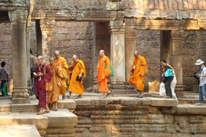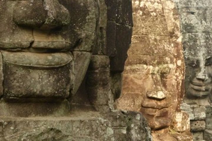 Siem Reap, Cambodia Shocking, the morning after a splendid reception and dinner at La Résidence the previous evening, to rouse ourselves a little after 4a.m., gather up camera, insect repellent, sunscreen and, most important, powerful little LED flashlight. Then down to poolside to be fuelled for our morning excursion with coffee and croissants. At 5:10a.m., we board our three buses for the short trip out to magnificent Angkor Wat, the largest Vishnu temple and arguably the largest religious building in world. It is still pitch dark, but we have been advised that we must be at the west entrance at least 45 minutes ahead of sunrise (which, today, is at 6:20a.m.). Our objective is to observe the spectacular sunrise over the iconic Wat. Our flashlights are a “must” as we navigate the long causeway, which seems much narrower than it does in daylight (no guardrails, so hug the centre) and enter the west gateway. We are escorted around a narrow ledge (watch that drop-off) inside the massive outer wall and take our places where we can get the best view of the towers. As the sky over the temple turns pink, cicadas break into song over by the modern Buddhist monastery to our left. And then, emerging from a low cloudbank to the east, the sun: just to the right of the tallest central tower, exactly as ancient Khmer astronomers predicted. We are a few days short of the Spring Equinox, when the sun will rise precisely over that main tower. The photographers go mad. Making our way to the “happy room” and beyond, we are treated to a concert of Khmer music played by young disabled acolytes near the monastery. We stop by the reflecting pool where the avid photographers can zero in on the wat and its image—unfortunately a little obscured by the low water of the dry season in Cambodia. We continue along the north side of the temple and stop to greet a large family of fearless, and very healthy, macaque monkeys, which are not hesitant to snatch food and items of clothing from unwary tourists. They are of all shapes and sizes from a newborn clinging to his mother’s breast to large and torpid grandmothers squatting along the pathway supervising the brood. Interesting how these animals have settled in this one area of the wat, with swift access if need be to the greenery nearby. But our attention is drawn to our main goal: the wooden stairway built to permit access to the lower platform of the Wat without further damaging the stone steps, eroded by a thousand years of use. On the way, we notice a single Buddhist nun, in characteristic white robe, meditating on a patch of grass, oblivious to the stream of visitors passing by. We realize that this is, and has been for centuries, an active Buddhist place of workship. In spite of the numbers of travellers, and probably because we are not here at the height of the tourism season, there is an air of tranquillity. Entering the lower galleries, we walk by some of the magnificent bas-relief friezes; if one should be really serious about understanding and analyzing the stories depicted here—the Ramayana, the Mahabaratha, the depictions of the king and his court, the interactions between heaven and hell and the “churning of the sea of milk” (which we will return to as we later enter the neighbouring Angkor Thom)—we could easily spend a day or more here, but time is short. On the second level, we note again the magnificently rendered carvings of Apsara dancers. Someone comments that “these cannot be Khmer women; they are far too well endowed on top”; I respond that these are celestial virgin dancers and “Indian” in provenance. We can look up at the temple mountain where the Hindu gods, to whom this confusing Hindu/Buddhist temple was dedicated, reside. Those who care to brave the 47 steps to the top have a wonderful view of the vast temple grounds and beyond. To the west, we see that some clever entrepreneur is offering rides in a tethered hot air balloon: no more than 200 metres off the ground, but a great adventure, especially for local tourists from the Cambodian countryside. An encouraging feature of the Angkor complex is that Cambodian citizens may enter free of charge. La Résidence provides its usual excellent breakfast/brunch, which might be enough for any ordinary mortal to skip lunch. Off go the more energetic participants to visit the markets or to try lunch at the classic Grand Hotel d’Angkor and to be disappointed that the “Elephant Bar,” strongly recommended by an old Siem Reap hand, who shall remain nameless, is closed until 4:00p.m. In the afternoon, we board a convoy of “tuk-tuk”s, a Thai name for what the Cambodians used to know as “ramok” (from the French “remorque”), a large rickshaw-like vehicle drawn by a powerful motor scooter. Arriving at the giant gate of Jayavarman VII’s “Angkor Thom” (Great City), we head immediately for yet another iconic temple, the Bayon. Originally built along the lines of other Hindu temples, with high towers, this was converted by Jayavarman VII, himself a late convert to Buddhism, into a Mahayana Buddhist edifice. It is unique in the world, as it features an endless display of human (or godlike) heads on the towers, most of which are topped by double lotus blossoms. In the jungle that had obscured most of the Angkor ruins by the 19th century, the French explorer André Mouhot, claims to have been surprised to see this giant face peering down at him from within the foliage. The tuk tuks take us further along the road through Angkor Thom to see the Elephant terrace and the Terrace of the Leper King, upon which once stood the gilded wooden palaces of the Kings of Angkor. Our stay in Siem Reap is topped off with dinner at Restaurant “AHA” near the old market in the centre of the city—a fitting celebration to see us on the next stage of our expedition. Those who wish to venture further, to visit the market or essay another attempt at the Elephant Bar, are free to do so