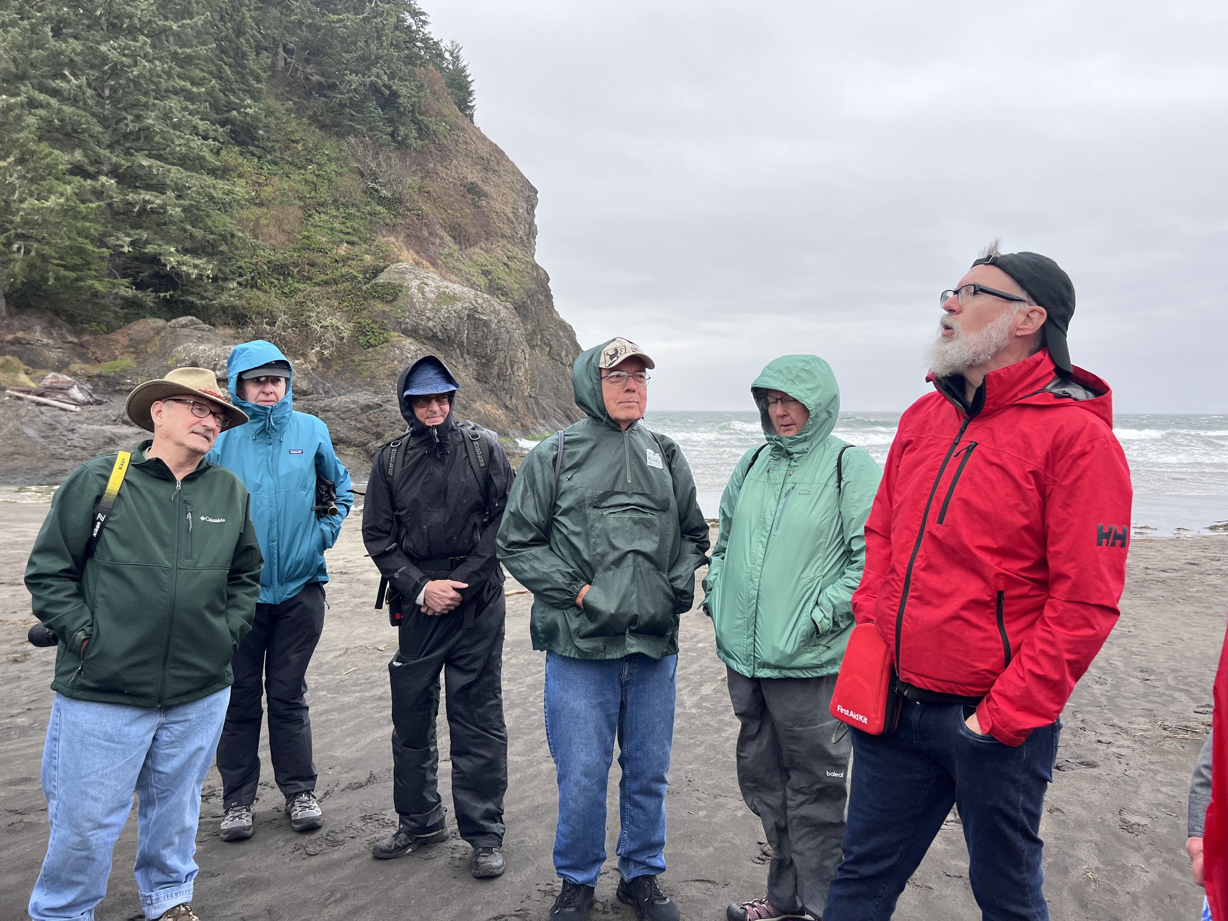 It was a rainy and beautifully overcast morning as we ventured to Cape Disappointment State Park for our tour of the Lewis and Clark Discovery Center. The lushness of the ferns and the lichen-covered conifers astounded us all. We began our hike at Waikiki Beach and dipped our toes in the Pacific Ocean, which was ripping with wild currents on this grey day. We trekked up the trail from the beach to the discovery center. The wind and rain accompanied us as we walked up through salal, western sword fern, and bearded lichen; we stopped occasionally to pick blackberries off the brambles. It was a breathtaking journey.