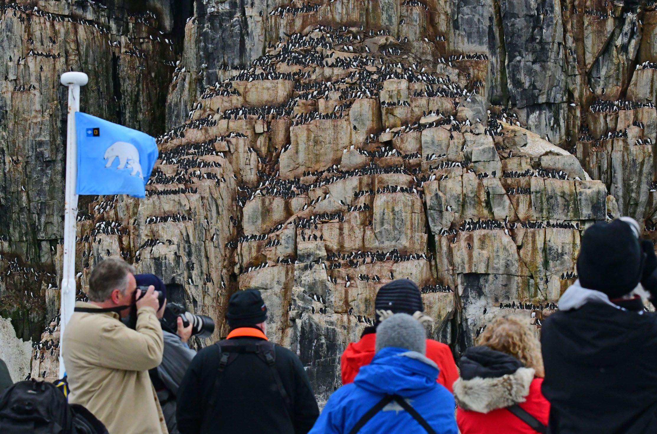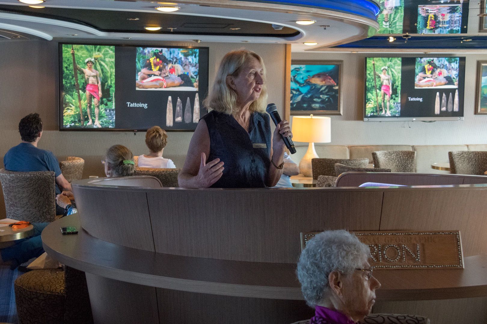 At sunrise, National Geographic Orion found herself cruising east toward Cook Island. It was an overcast morning and what could be seen at the distance was an immense body of water. The distance to covered was around 750 nautical miles. These moments at sea were a great opportunity to enjoy the facilities of our ship. A set of great presentations were given in the lounge and enjoyed by our guests during the morning. In the afternoon, we had the honor of enjoying the music performance of Kura Happ and her grandmother Tekura Ruaporo. At the end of the day, we had to conclude that the Pacific Ocean is a large body of water in which for centuries the Polynesians explored and populated remote islands for generations.
