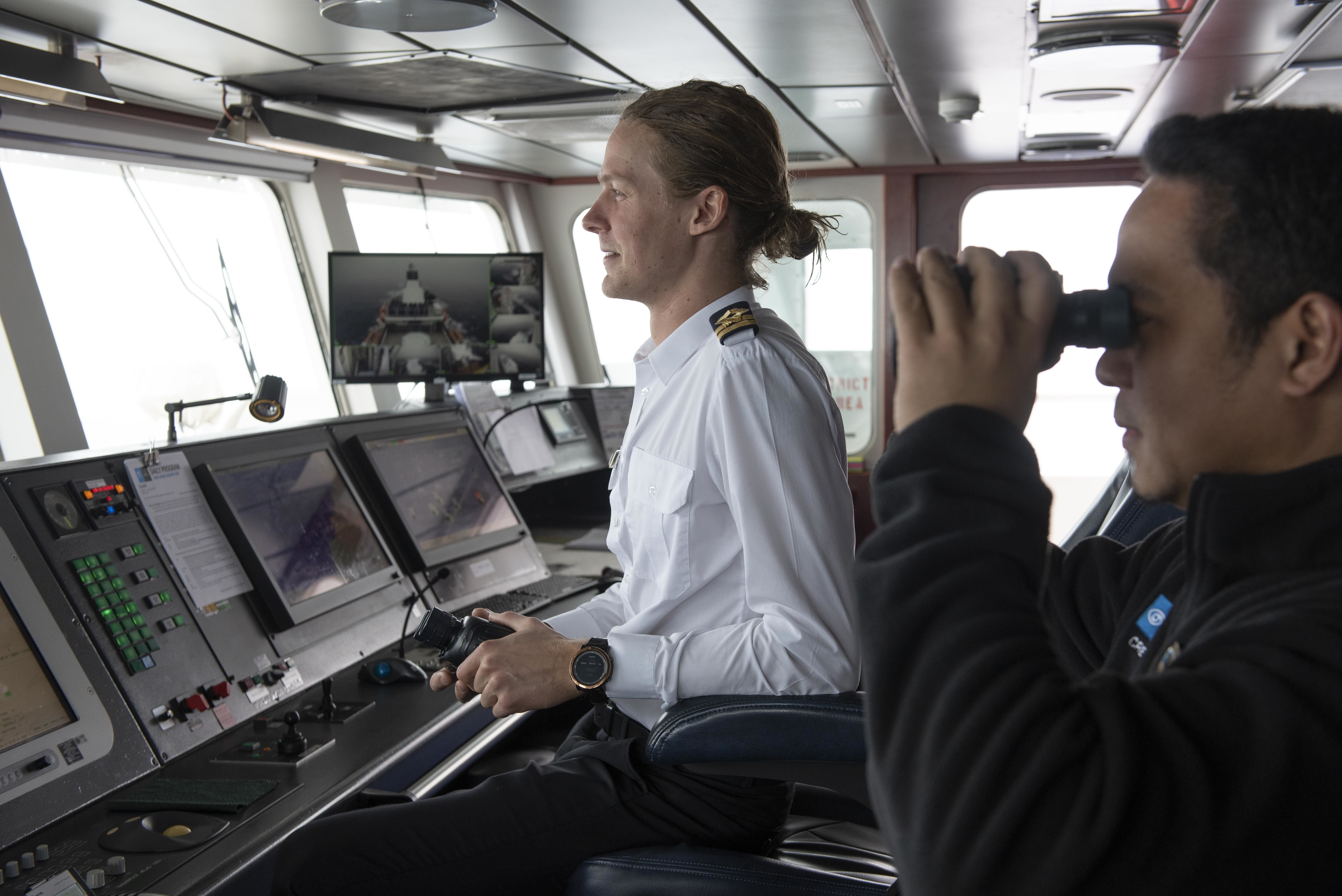Despite the calm seas, persistent fog kept the bridge officers on their toes, monitoring with radar equipment and binoculars for stray icebergs caught up in the strong Southern Ocean currents. Many guests joined in on the bridge, learning about navigation and identifying the myriad seabirds that call the open ocean home.