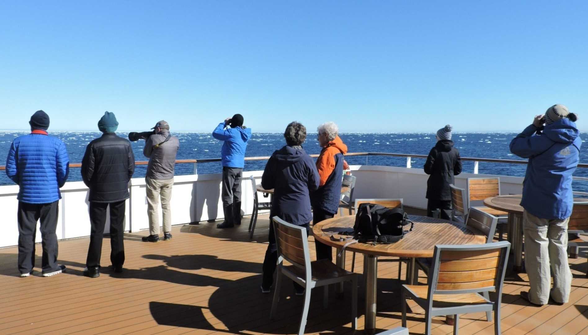 We spent the day making our way along the pack ice, far off the coast of East Greenland. Foggy early morning conditions did not allow us to search very deep into the ice, but conditions improved immensely by late morning, and we enjoyed nearly perfect conditions for the rest of the day. Many of us spent time on the aft deck, where we could sit or stand in the sun, away from the wind, and watch various birds following the ship.