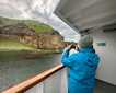After lunch, we hit the decks again to view some wonderful walruses that allowed us to watch them snooze on pieces of floating ice. Lucho made another announcement. Since it was such a lovely day in a beautiful location, the ship would be offering us the opportunity to polar plunge! While the crew and staff made preparations, over 40 of us prepared ourselves to surrender to the cold waters of the Arctic. Once all was in place, we lined up in basecamp for our turn. One by one, we jumped off the bow of the Zodiac as small icebergs drifted by. Squeals were heard as guests experienced the -0.5°C water followed by laughter and cheers with every new initiate. Everyone who jumped received a patch to commemorate the insanity, and we were greeted with hot cocoa back on the ship. We all scurried back to our rooms or to the sauna to warm up after the experience.