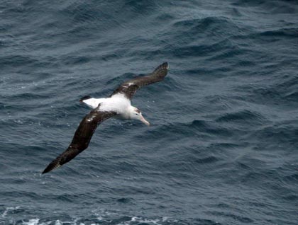 We are sailing in an east-southeast direction towards South Georgia, entering into the zone known as the Polar Front. This is the northern boundary of the Antarctic Circumpolar Current, which brings north the cold and nutrient-rich waters of the Antarctic. South Georgia is right in the path of this current driven by the prevailing westerly winds and the topography of the seafloor. For those of us watching the bridge’s navigation equipment, the most significant change is the marked drop in the sea surface temperature. Suddenly, the ocean surface is two degrees colder, the gray skies had turned into a dense fog that comes and goes as warm air meets cold air. Our eyes are incapable of seeing too far, but the mist does not seem to affect the magnificent fly of the wandering albatross.