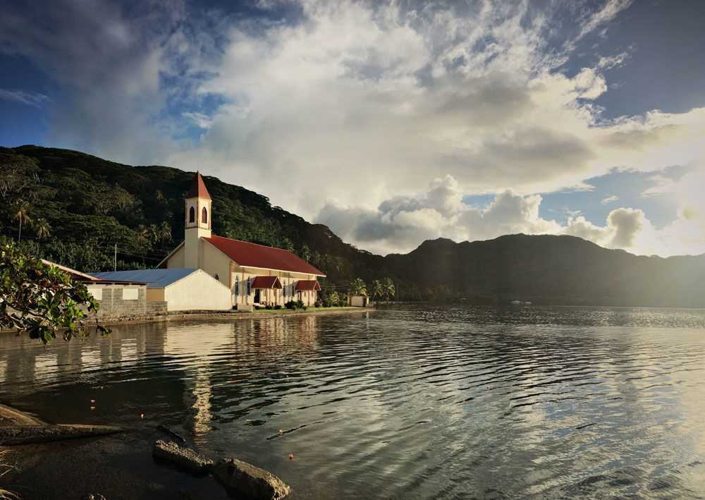 The other icon of spirituality was a pale yellow Protestant church, whose bell tower rose just a few hundred yards down the coastline. With striking lush volcanic mountains rising behind, it was an impressive site and representative of the Pacific's dramatic shift to Christianity after the arrival of missionaries beginning at the turn of the 18th and 19th Centuries. Today, almost every Polynesian is Christian, although every denomination can be found across the islands, from to Adventist to Catholic, Mormon to Methodist.