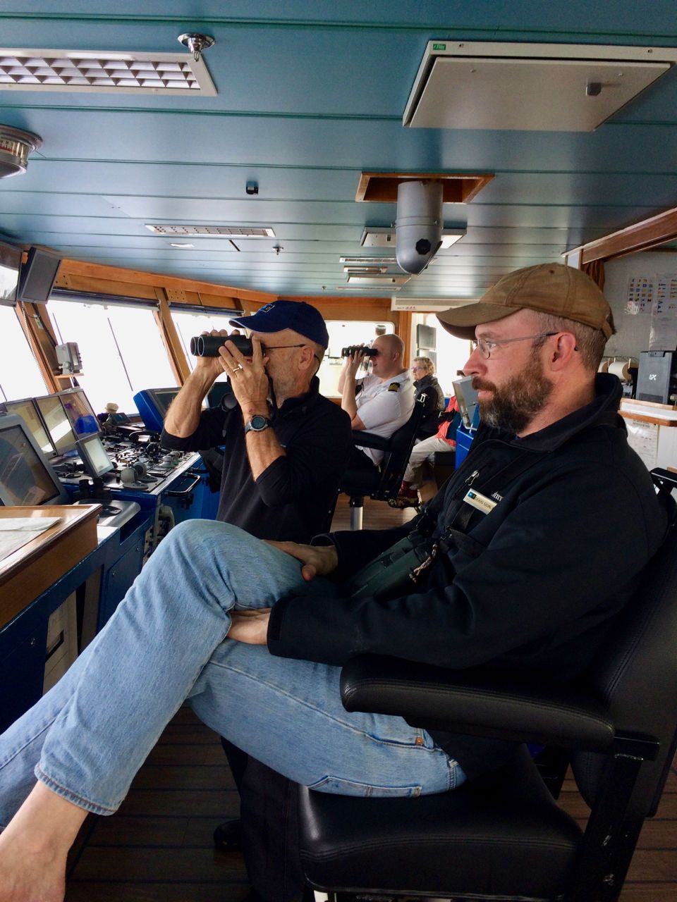 So, why do I mention all of this? It is part of at least some people’s mission on this voyage, to come to a unique place to find a rare killer whale, a race known to hunt in the zone of Convergence with its concentrated plankton and it grazers and hunters. On board we have two NOAA researchers, Bob Pittman and Jared Towers. Bob has traveled with us before, using our ships as research platforms. Both Bob and Jared are fixtures on the Bridge scanning the seas for blow or fluke marking the presence of whales, and if they are diligent and if they are lucky, we will encounter the Type D killer whale and who knows what will happen then!