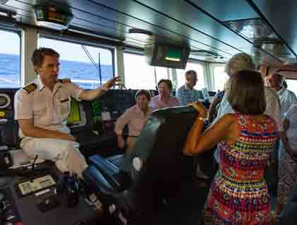 Making good time, a series of presentations introduce us to the natural and human history of the area. In the morning, Captain Vincent Taillard hosted tours of the Navigation Bridge, explaining the high-tech equipment that enables the National Geographic Orion to circle the globe exploring both tropical and polar waters. National Geographic filmmaker David Wright followed with a screening of his documentary “Rainbow Serpent,” a film that brings to light the snakes of Aboriginal legends. During the afternoon, naturalist Anthony Copogreco recounted the tales of the World War II incident involving the S.S. Koolama along the Kimberly coast.