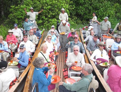 Towards the mid-exploration outing, all three skiffs stopped in a beautiful location overseeing the river and its healthy forest, and then the real treat of the morning started. Our galley and hotel department crew put together a special “outdoor” breakfast, and we all enjoyed the same level of service that we have normally on board, but this time immersed in the Amazon forest!