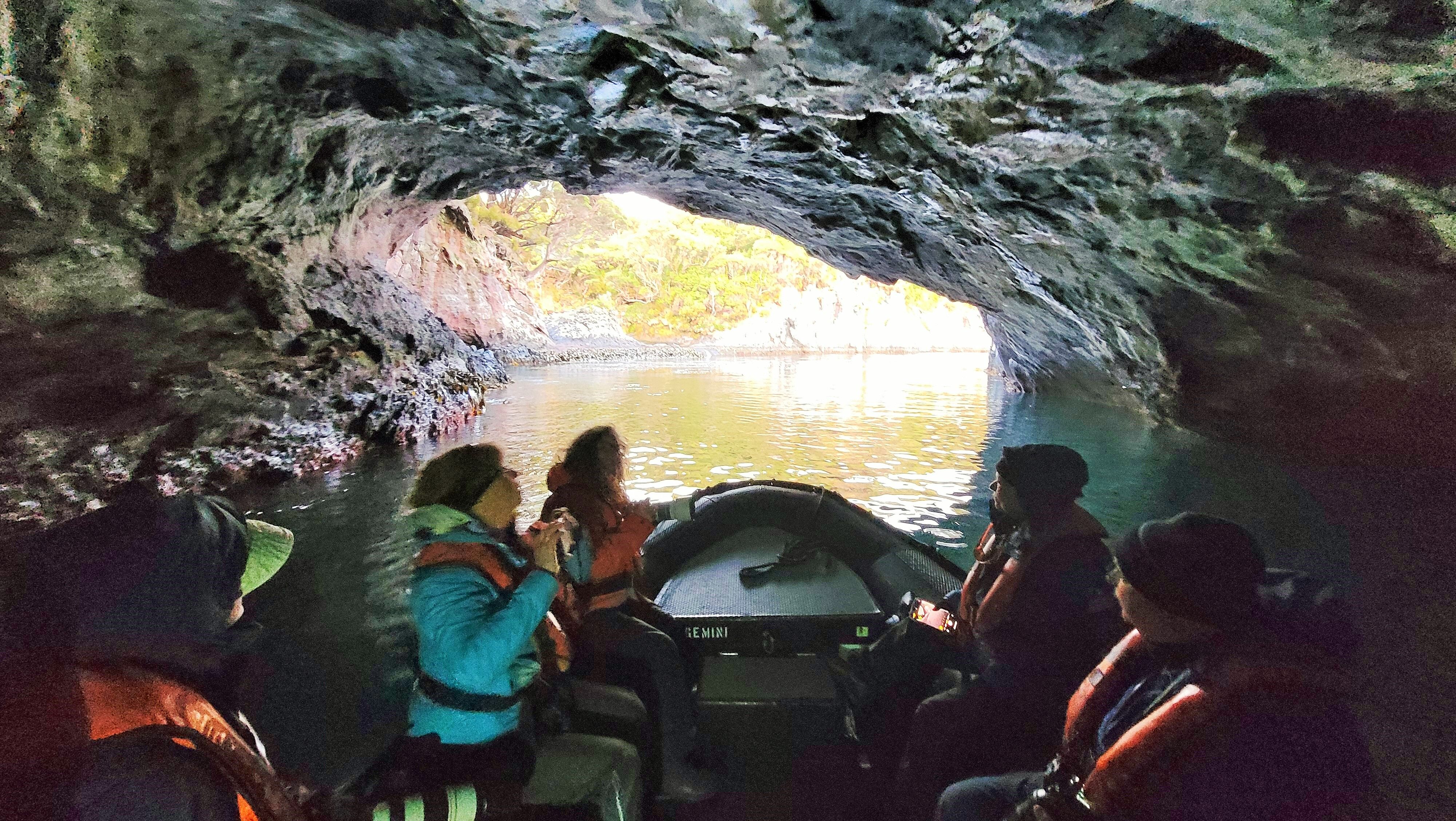 After a successful voyage through New Zealand’s Subantarctic Islands, National Geographic Orion motored into the inviting sub-tropical port in Tauranga. An adventurous group of paddlers slipped into colorful kayaks for an exploration of Lake Rotoiti. Endemic dabchicks dove into the murky depths, while vibrant New Zealand shelducks escorted their ducklings into the thick vegetation. Our local guide, Lucy, explained that the deep waters of the lake had once been an explosive volcanic caldera, with geothermal pools reminding us of this violent past. While we sat under the crimson flowers of a northern rata tree, we eased our kayaks into the aperture of a small cavern. As our eyes adjusted to the darkness, bright lights appeared upon the cavern’s ceiling. This spectacle is the creation of a unique fungus gnat, known as a glow worm. The adult gnat does not feed, though it’s predatory larval phase most certainly does. The worm-like larva creates sticky threads which it suspends from the roof of humid caverns. Bioluminescent bacteria illuminate the minute filaments in order to attract unsuspecting victims. The result is a cavern full of light, which left us in awe of New Zealand’s unique biological treasures.