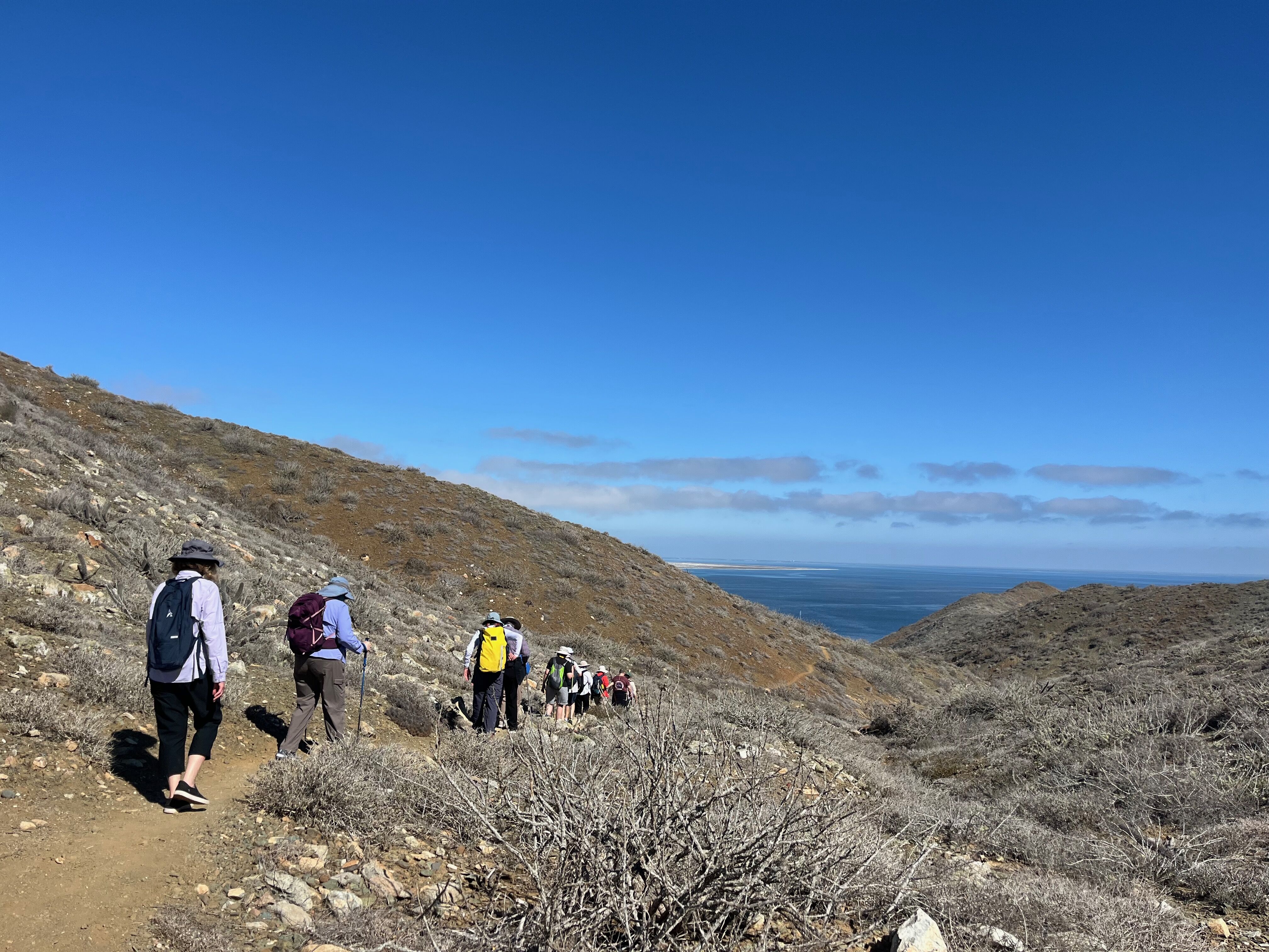 What can I say about today? Magical . . . unforgettable . . . spectacular . . . “whale soup”. We went out in pangas in the morning and again in the afternoon, seeking gray whales in Bahia Almejas. With ideal conditions, calm wind and water, we were rewarded with excellent views of gray whale blows, backs, heads, and flukes as they rolled at the surface, took breaths, and occasionally came close to our pangas. They spy hopped (lifted their heads vertically out of the water) and swam slowly.