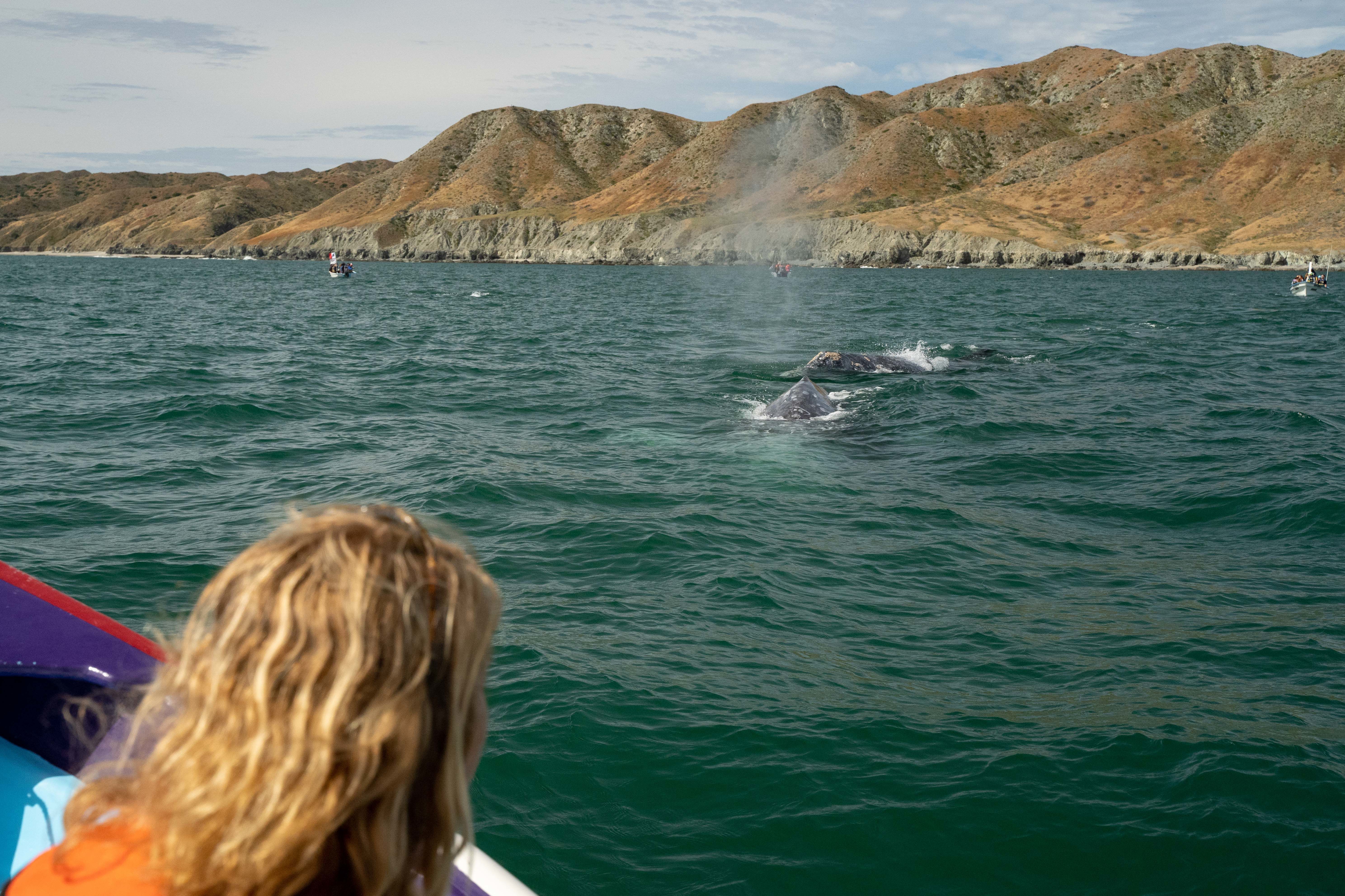By 10:00 a.m., the pangas that had departed National Geographic Venture for Bahia Almejas were in the middle of cetacean soup. Gray whales were spouting in every direction, and spyhopping like 40,000 pound versions of Whack-A-Mole. Our little boat – just over half the length of a fully-grown adult gray – rocked in the waves as whales surfaced and dove around us, and at one point we were lovingly nudged by a whale directly beneath our hull. The baptisms by whale breath were a bonus. Given the amount of post-Valentine’s Day courtship that was taking place among the giants, eau du gray sneeze could fare well as a very eccentric perfume.