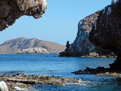 North winds and choppy seas gave us an interesting ride until midnight, when our adventure took a new direction, a southerly one. At first light we entered Bahía Concepción near Mulegé. This area is quite popular because of the protection it provides amongst small picturesque islands and sandy bays. There is a backdrop of rough and ragged volcanic mountains colored like red bricks intermingling with coarse blacks and soft tans of the landscape. Our flexible expedition style allowed for a fleet of kayaks to be quickly readied on the beach of Isla Coyote. Kayakers circumnavigated the island and offshore rocks and enjoyed being captains of their own crafts. Pelicans and frigatebirds were their quiet companions.