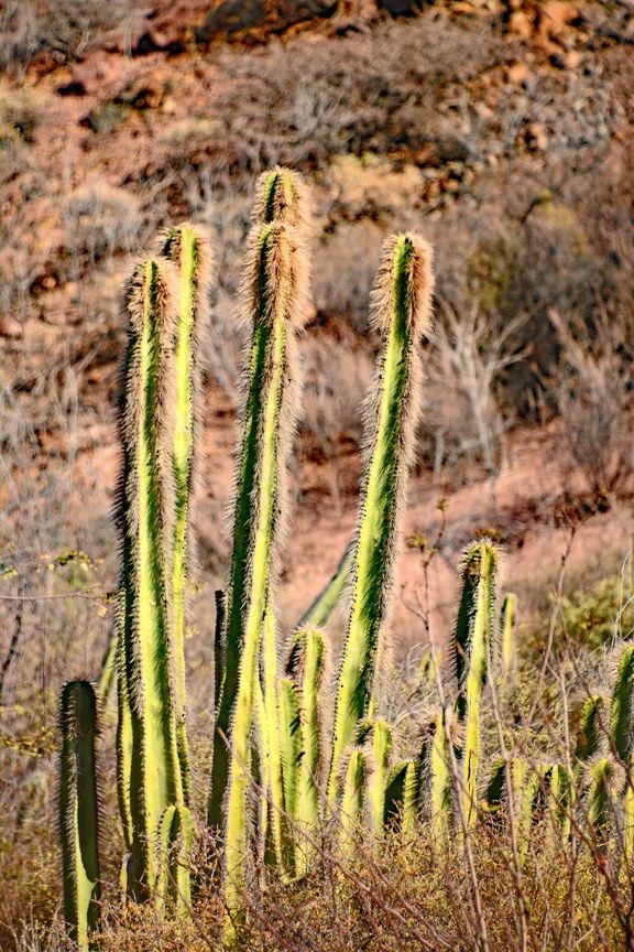 The vegetation of the island was no less interesting, having consisted heavily of organ pipe, galloping, and cardon cacti. The high cliffs demarcating the island were just gorgeous, seemingly immense against the set sky, fragmented and vivifying, all adorned in blooming and fruited cardon cacti.