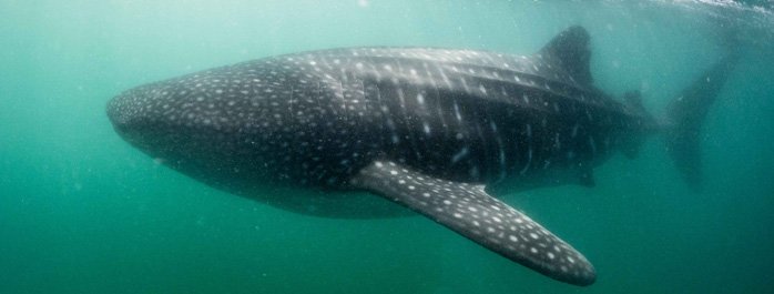 As we devoured a Mexican style lunch, the wind continued to increase, but not enough to ruin our boat rides to the protected bays. Finding whale sharks requires that you cruise along looking for submerged dark areas that are not rocks. If your discovery slowly moves, then a rush of adrenalin takes over as the object begins to take a form. Their incredibly wide heads, beautiful cloaks of linear spots, and long sweeping tails moving slowly from side to side conjure up the thought of imaginary spirits of the sea. If there ever were any, they would be whale sharks.
