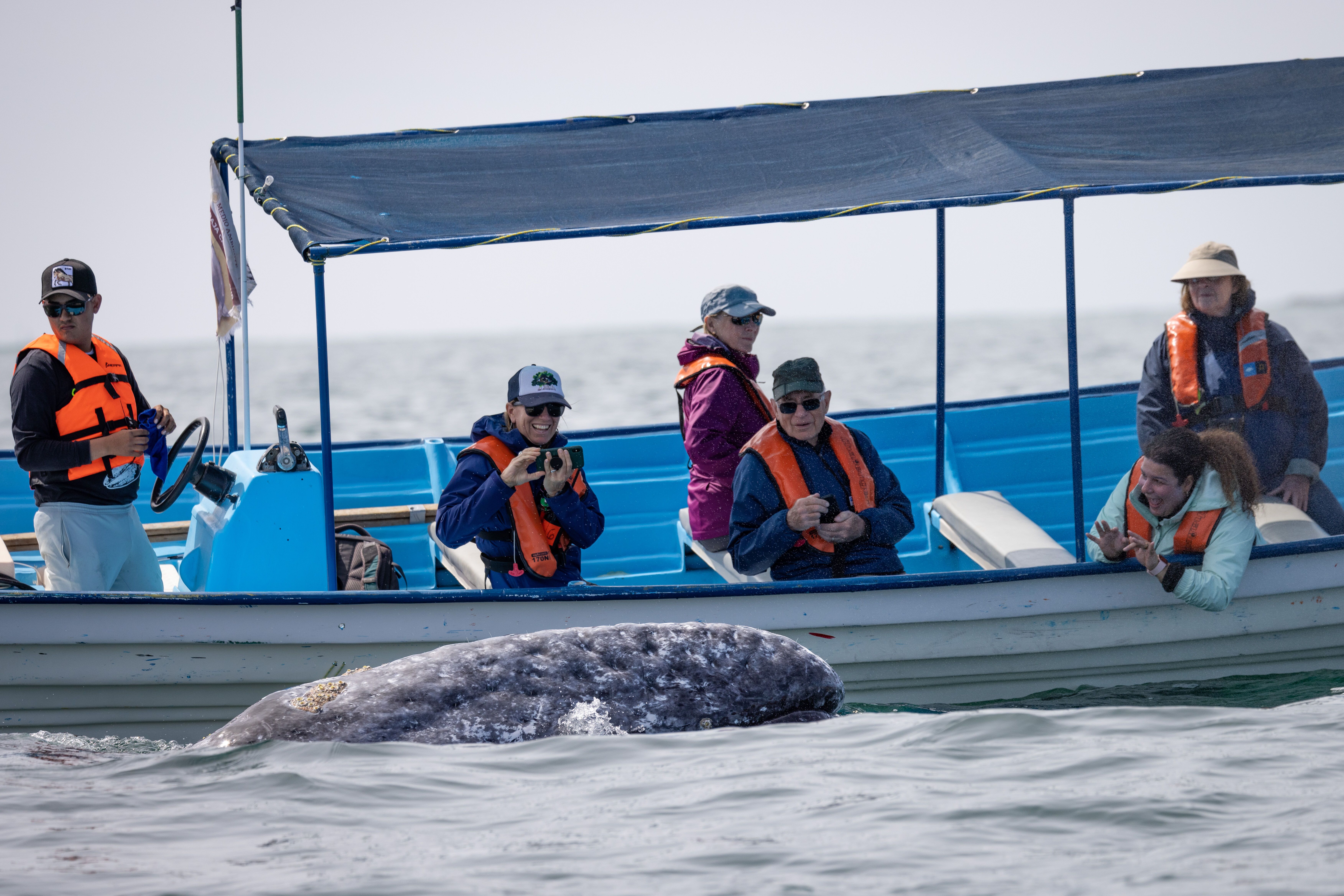 Today the passengers of National Geographic Sea Bird awoke in the northern, narrow part of Bahia Magdalena to an announcement of a gray whale mom and calf pair resting right off our bow; this set the tone for the rest of our day. Our local panga drivers hail from the nearby town of Lopez Mateos. They drove us out into one of the most important nursery grounds for these gray whales where we had an experience that was beyond amazing. A good portion of our guests had the very special honor of interacting with a friendly mom/calf pair, getting to touch and some getting to kiss a sweet baby whale. This cute little calf did the rounds, going from boat to boat and allowing guests to give some scratches and love. It was a life changing experience for both our guests and naturalists, as well as a great moment of reflection on the incredible transformation these whales have gone through from “devil fish” to the “friendly whale.” After a full day of whale watching, we ended our night enjoying cocktails on the beach with a full charcuterie board and s’mores. We watched a beautiful sunset and acted like kids, leaping off the sand dunes as whales continued to swim along the nearby shore.