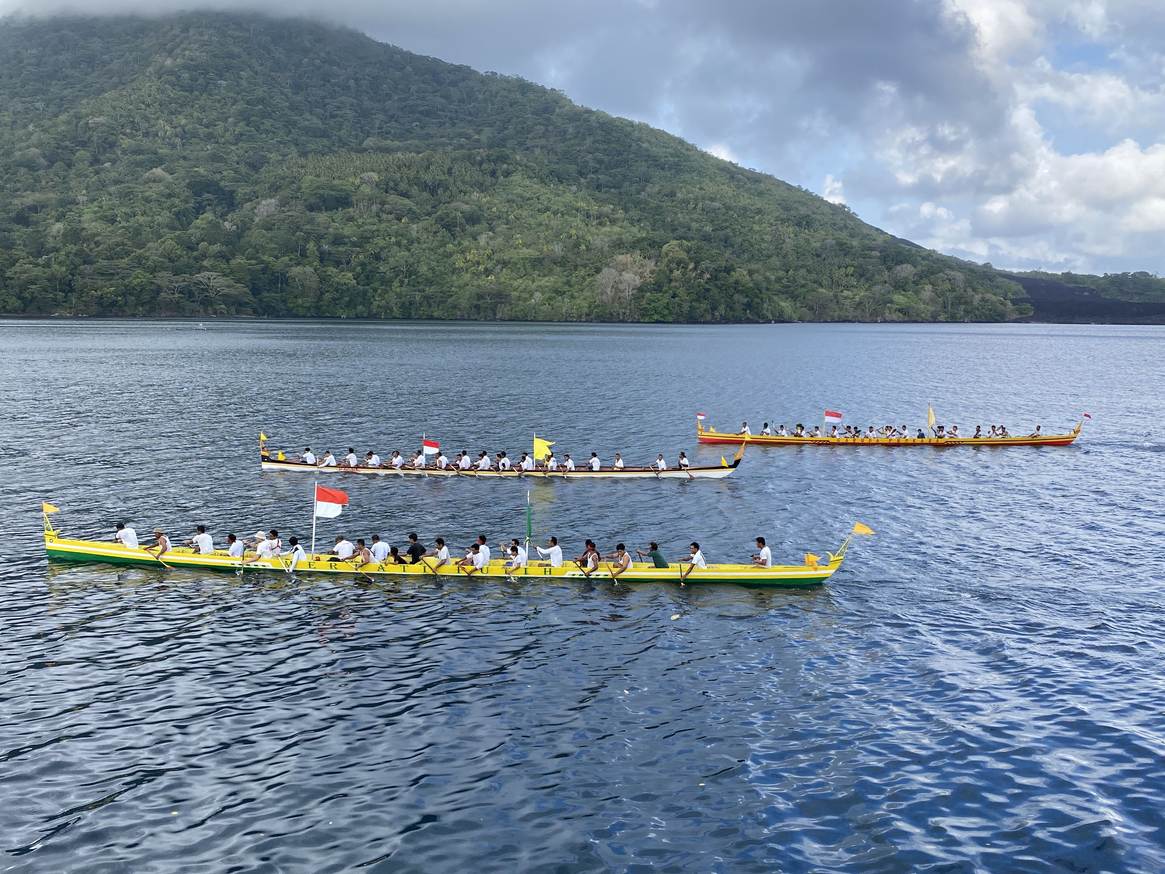 This morning, National Geographic Orion awoke off Banda Neira in the Molucca (Maluka) Islands in the Banda Sea. From the bow, we had great views of the perfectly shaped volcano of Banda Api. As we approached Banda Neira, we spotted the welcoming committee as they staged for our arrival. Three large traditional war vessels (kora kora) approached with 45 men paddling to the beat of their war chant alongside the ship as we entered the channel. What an incredible reception! As we approached the dock, performers began dancing with the mosque and old fort in the background.