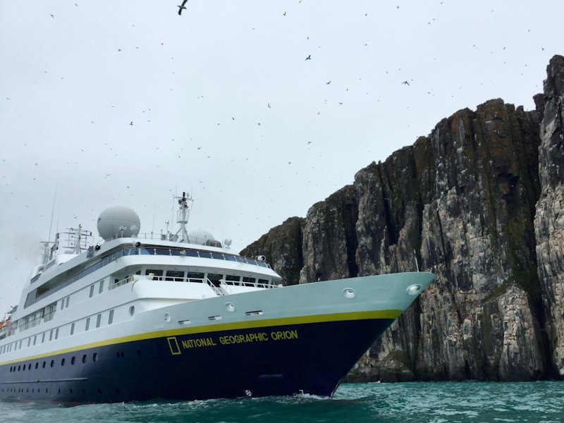 During lunch the ship moves towards our stop, a small island called Chinese Hat. The same stark volcanic features dominate our view, and once more we head out for snorkeling. This time many of us have a more lasting encounter with penguins, since there are several in the calm waters, seemingly careless about our presence, hunting the small anchovies that litter our underwater view.