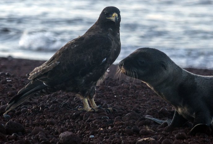 Over the next four hours we left the ship for various excursions: deep-water snorkeling where green sea turtles, stingrays, sea lions and white-tipped reef-sharks showed up at one time or another; kayaking along the spectacularly tall red cliffs of Rabida Island and the length of the long, red beach; and a visit on shore for a walk along the magnificent shoreline where a young Galapagos hawk flew down and landed next to us, then proceeded to walk around the small colony of sea lions, and chose to finally visit with a female sea lion who had given birth within the last two days. Her pup was curious as well about this unusual life form that suddenly appeared next to it! As the pup and hawk got closer and closer, we could see the mother keeping a watchful eye on her pup, however in the end, nothing dramatic occurred between them. Only very weak, abandoned sea lion pups are in danger from a Galapagos hawk. There are limitations to the strength of their beaks and small lava lizards, hatchling iguanas, and small land birds are more common as prey items. This situation seemed most likely a case of curiosity unbounded – a young hawk, a young sea lion – both discovering the world.