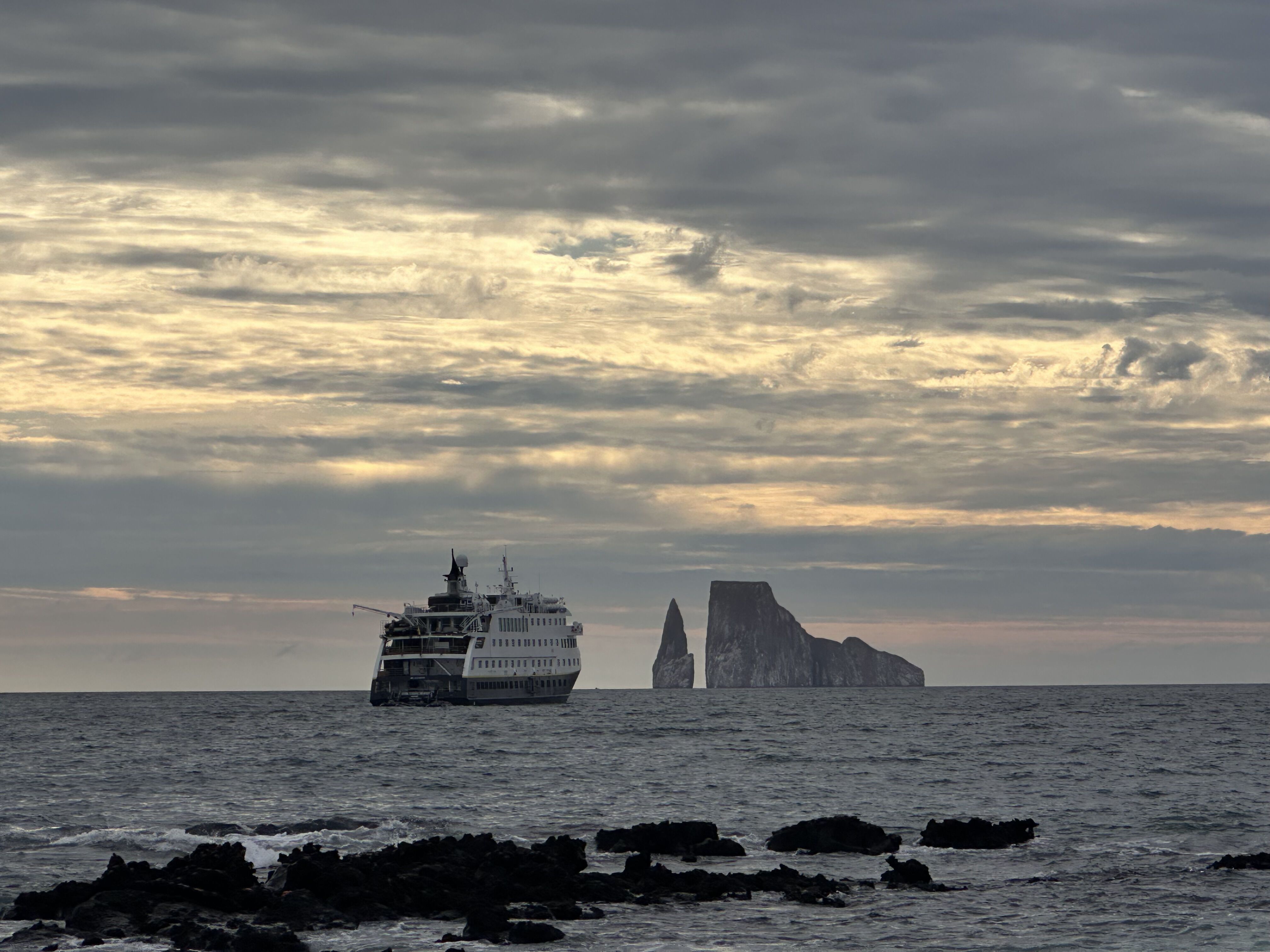 In the afternoon, rain surprised us, and after it cleared up, we had a beautiful Zodiac ride near a mangrove ecosystem. Here we found many baby blacktip sharks, sea turtles, and night herons perching on the branches. The area is full of cacti and land iguanas looking for their fruits. We returned to our boat with the beautiful light of the sunset.