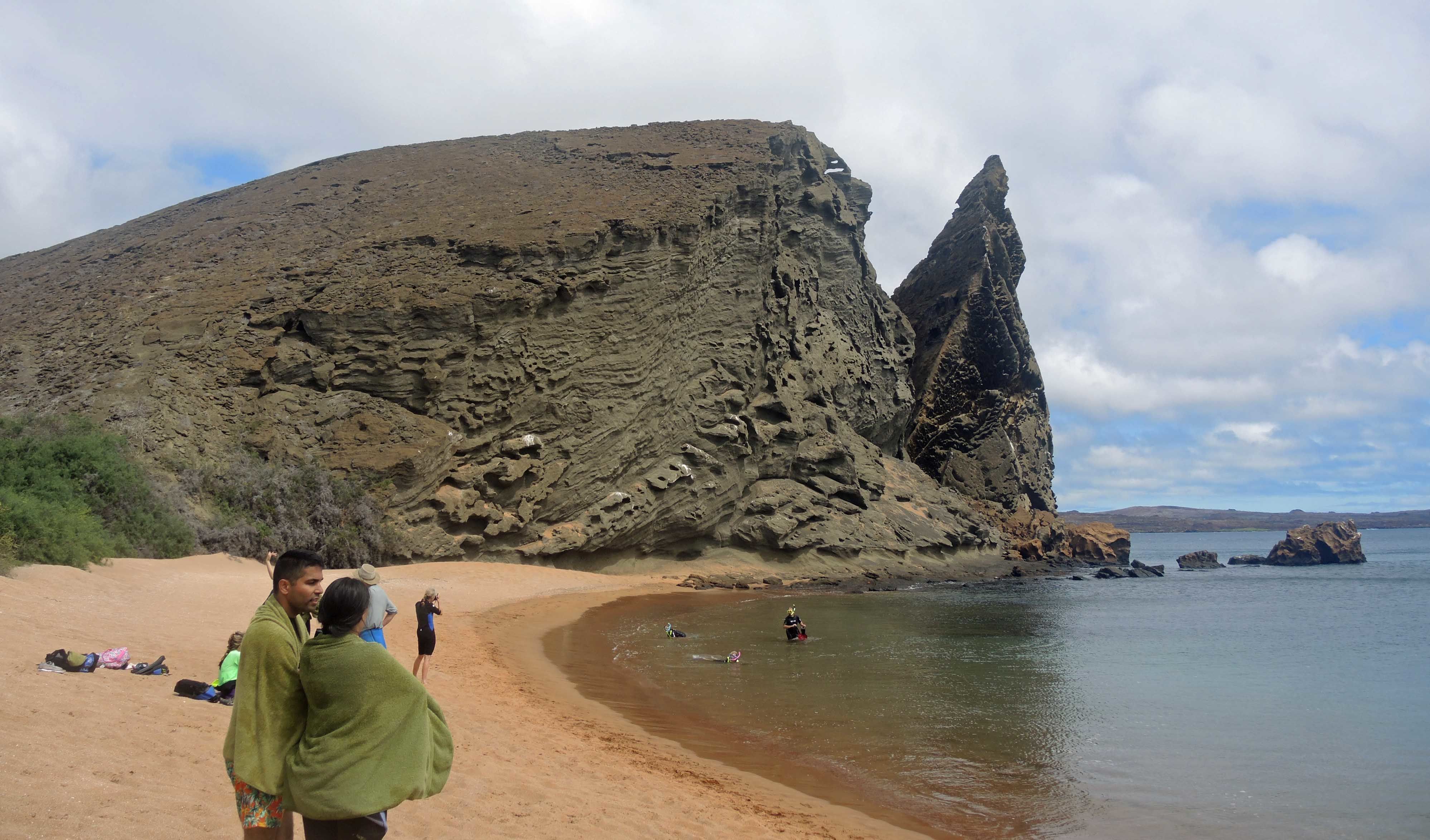 On the second day of our trip, we took an early walk on Bartolomé, a small islet located at the east of Santiago Island. Walking on this trail is like visiting another planet! Volcanic shapes, craters, lava rocks, and some other geological features reminded us of distant places such as the moon or even Mars. Few plants and animals live here, but the landscape is so impressive that one could spend the whole day admiring all the details. Once we reached the highest point at Bartolomé, we could see one of the most emblematic landscapes of the Galápagos, Bartolomé’s pinnacle with its two beautiful beaches. We were also able to see part of James Island with its intricate black pahoehoe lava designs.