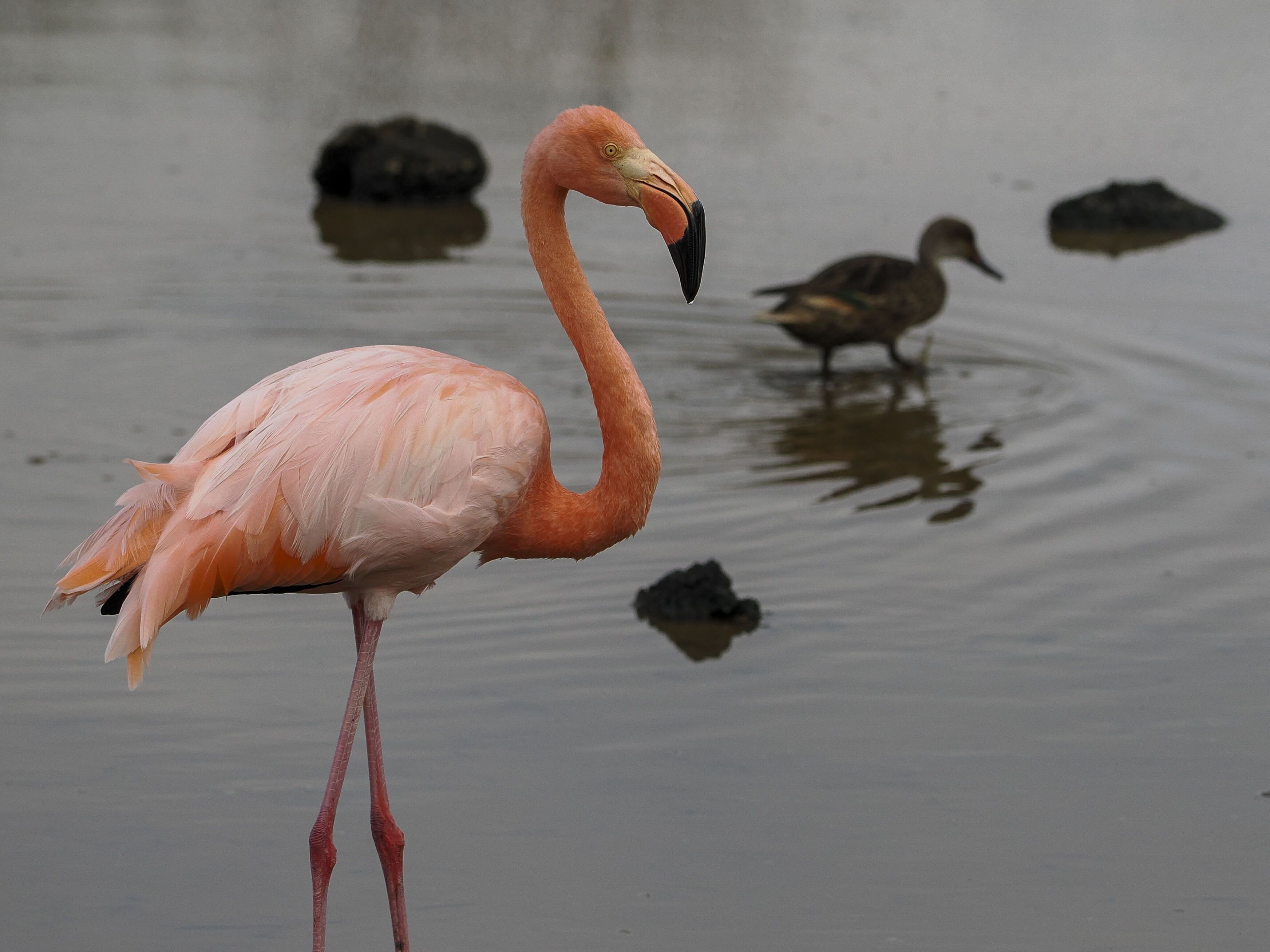 In the afternoon, we visited Dragon Hill on Santa Cruz Island. The wet season is starting, and leaves are growing from the branches in the incense tree forest. Crustaceans and other invertebrates are more and more abundant in the lagoons. This attracts land and shorebirds like stilts and flamingos. We found many flamingos that have arrived to feed from the wetlands! The mating season for land iguanas has started, and the males are the yellowest they will get. The still dry vegetation provides a high contrast and makes the iguanas stand out from their nesting grounds.