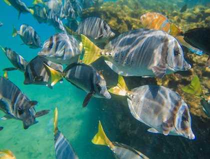 In the afternoon, the National Geographic Endeavour dropped anchor just in front of Sombrero Chino Island, otherwise known as Chinese Hat. Our first outing in the afternoon was snorkeling along the channel that separates the islands of Santiago and Chinese Hat. White-tipped reef sharks and eagle rays swimming indifferently close to us were a big attraction. We were drifted by the currents, observing many different species of colorful fish such as king angel fish, salemas, parrot fish and some sting rays hiding under the sandy floor.