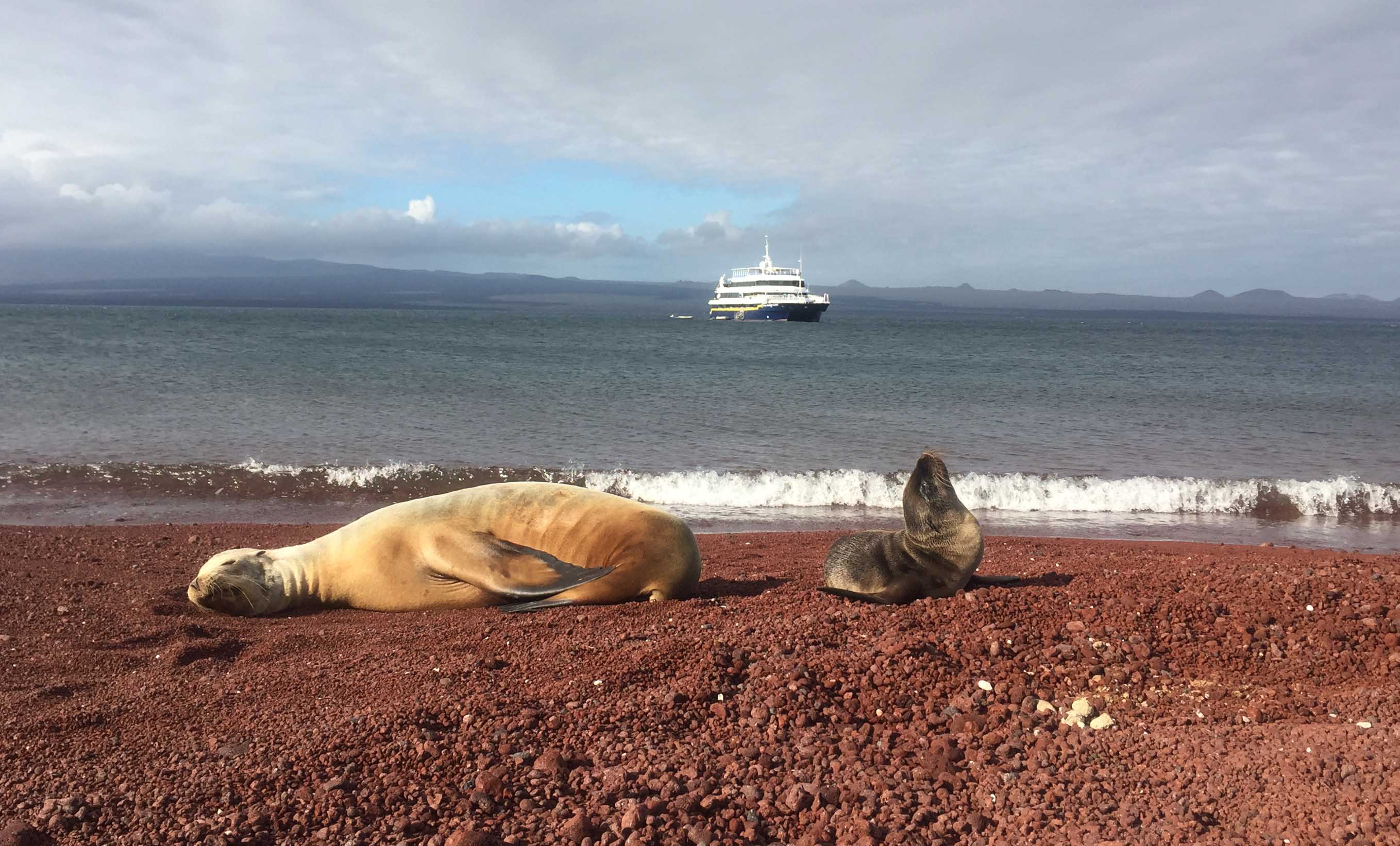 With the last sunrays, we found ourselves walking along a red sandy beach with a sleepy Galapagos sea lions. The light was golden, perfect for photographing sea lions and pelicans in full action. Minutes later, we moved behind the beach to observe different species of sea shore birds while on the trees some yellow warblers and vermilion fly catchers called the attention of our guests; it was late, the sunset looked spectacular and it was time to back aboard National Geographic Islander. Just before sunset, we headed back to the National Geographic Islander, observing the red beach and the sea lions that captivated us today forever.