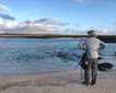 Today we had a very early wakeup call to start our amazing expedition, and we couldn’t be happier. First, we enjoyed a Zodiac ride along the coast of Bartolome Island looking for penguins. We had a very unusual encounter with a Galapagos sea lion feeding from a tuna on the rocks, literally tearing it apart. We were all very amazed and spent some time just watching him eat his very fresh breakfast! A white tip reef shark was around as well, trying to get the leftovers that were dripping into the sea. A Sally Lightfoot crab was also nearby, ready to get its portion of the meal. Penguins were swimming by during the feeding session, too.