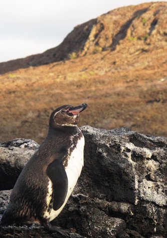 In the afternoon we had another destination to explore. The National Geographic Endeavour navigated further south along the Santiago Island coast to reach a group of small islets. One of them is Sombrero Chino, named after its peculiar shape which resembles a typical Chinese hat. A narrow channel with turquoise and tranquil waters separates this islet from the Santiago coast. Many guests took another opportunity to snorkel here. With relatively clear waters, they had close encounters with many fish species, even spotted eagle rays and white-tipped reef sharks. Toward the end of the afternoon we returned to this area to look for the ever charismatic Galápagos penguin. This is the third smallest penguin in the world, and a small colony inhabits these shores. We were successful, as we found four of them on the rocks near their lava homes, drying their plumage in the dying light of the afternoon. The setting sun spread its beautiful yellow light on the nearby coast, islets and islands. We felt the peace of this magic place around us. What a wonderful way to end the day!