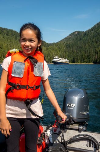 The day began at anchor in Bailey Bay, a lovely secluded cove, with sunny skies and terrific reflections. During the morning, we participated in a variety of activities. Kayakers paddled around the ship and shorelines and were treated to the sight of a humpback whale lazily plying the waters. Expedition landing crafts zipped around on tours of the area, allowing those aboard to photograph the whale and some wildflowers. Hikers headed to shore, where they hit a trail that angled steeply into the forest. After passing a meadow, the hikers crossed a waterfall that plunged across the trail, and soon arrived at a stunning view. A lake fed by snowmelt rested under the mountains and a river poured off the cliffs, tumbling a few hundred feet to the bay below. After donating blood to the local insects, the hikers continued along the edge of the lake. They passed huge boulders with ice nestled in the shade, creating a natural air conditioner which was welcome on this "hot" day. Once back on the ship, our Global Explorer (age 11) joined the staff for a plankton tow, where she drove an expedition landing craft and gathered plankton for further inspection. Everyone had a chance to observe active zooplankton under the ship’s microscope.