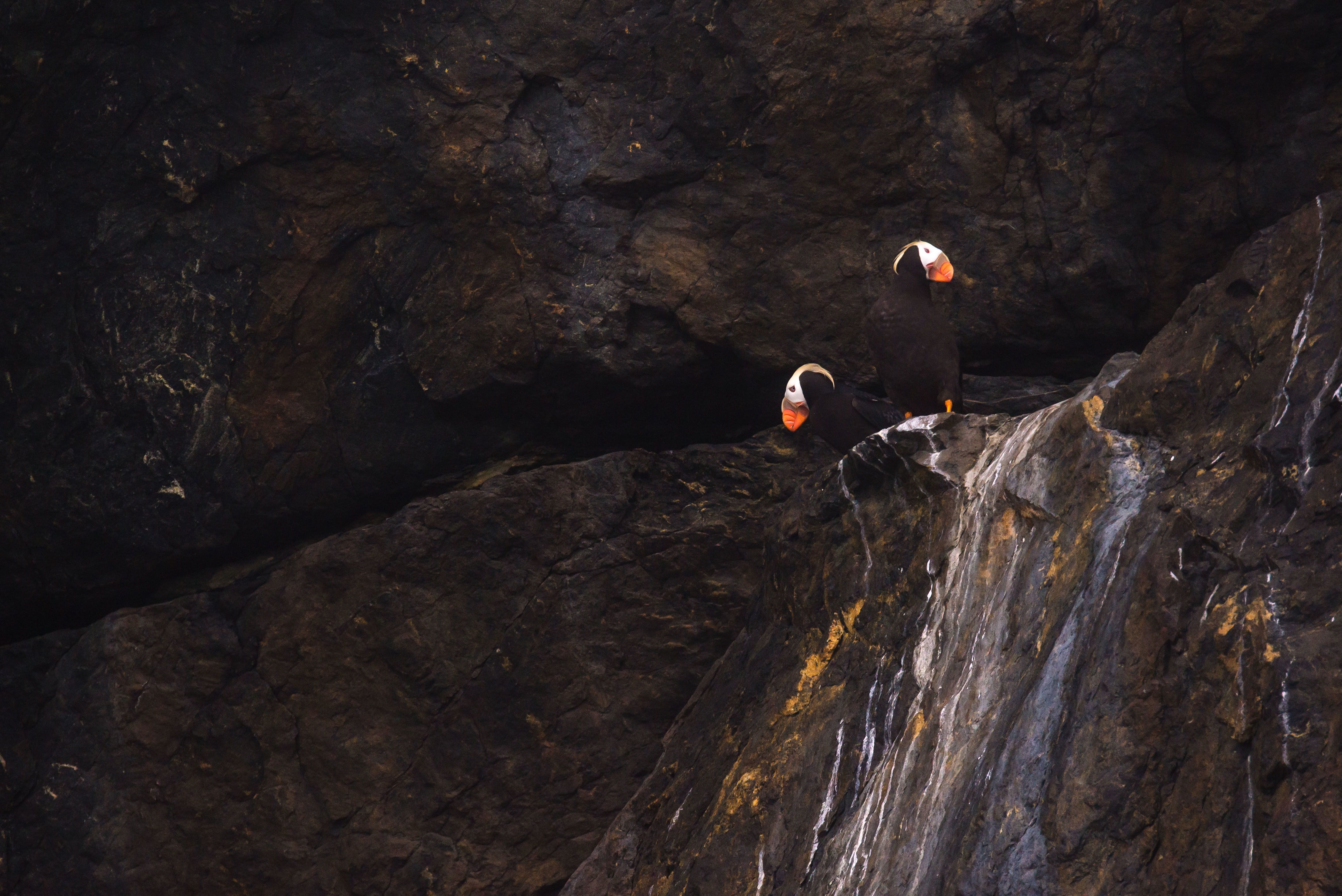 After the meal, we passed through a rock formation resembling a large owl, and we found ourselves in a secluded bay where we lowered kayaks and expedition landing crafts. We noticed that the heat had dried up many of the waterfalls normally cascading down the sheer rockface. Even the streams were dry—there wasn’t enough water for mature salmon to enter.