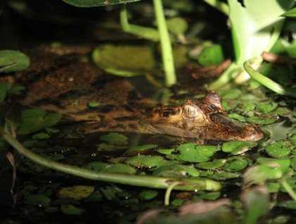 Skiff time! We boarded our skiffs and went to explore this area. Our goal: Caimans! We stayed until the sun disappeared from the horizon and then with special lights we explored the area. We spotted fishing bats and of course caimans! We found caimans in the water and caimans on land as well. What a chance for nature photography! We observed some fish jumping out of the water, for sure chased by a predator. The Southern Cross showed us our way home, as the night was amazing, far away from the light pollution we could see the stars like nowhere else!