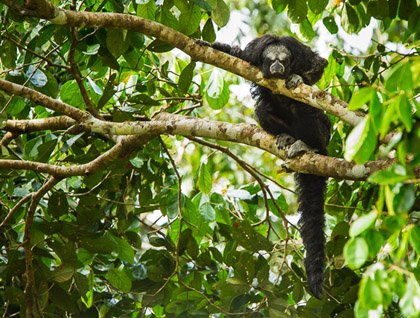 On a calm morning such as this, any motion in the trees can mean only one thing—monkeys. We stop to investigate and find both squirrel monkeys and saddleback tamarin leaping between branches. But the highlight of the morning is a great view of a family of secretive and rare night or owl monkeys sleeping in a hollow tree. As we nose the skiff under some overhanging branches and look straight up to see four pairs of eyes looking down on us. True to their name, these nocturnal monkeys have large owl-like eyes for hunting at night. As we watch them they are having trouble staying awake, and in fall back asleep by the time we pull away.