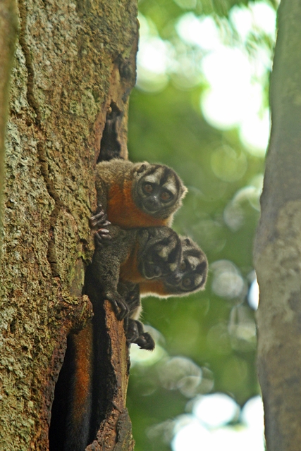 Belluda Creek is an isolated small tributary of the Ucayali River, which we will be exploring for the next few days. There are several species of animals that like this isolation, and we dedicated our morning looking for them. Our first outing was precisely along the river-banks of the Ucayali, along an area known as the “Aguajales”. The palm tree locally known as “aguaje” happens to be not only abundant in this particular area, but it is the favorite nesting tree for the Blue and Yellow Macaws. With their large and powerful beaks, the macaws (or any related species) break through large seeds for feeding and rip apart large chunks of the palm tree-bark to create their nests. Their colors are powerful and can be seen from a far distance, which made it somehow “easy” to spot them. We spent some time looking and photographing these beautiful birds; we then move onto find more species. As the morning progressed, we entered the creek known as Belluda, and it was then where more species such as the monk saki monkey and the nocturnal owl monkeys were also found.